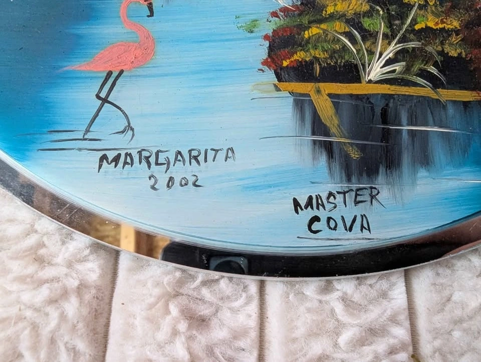 Beautiful three-piece mirrored wall art set, hand-painted directly on mirror glass. Signed Margarita 2002 and Master Cova, this tropical scene features flamingos, egrets, palm trees, and a moonlit lagoon — vibrant Caribbean craftsmanship from Isla Margarita, Venezuela. The paint sits on top of the reflective surface, giving the artwork a shimmering, 3-D glow. Each section — one round center mirror and two crescent sides — forms a unique triple-moon design perfect for tropical, coastal, or boho décor. ✅ Hand-painted on real mirror glass ✅ Dated (2002) ✅ Excellent condition – no cracks or major wear ✅ Eye-catching color and shine ✅ Ready to hang 💵 Price: $75 CAD (OBO) 📍 Pickup in Smithville / Grimsby
