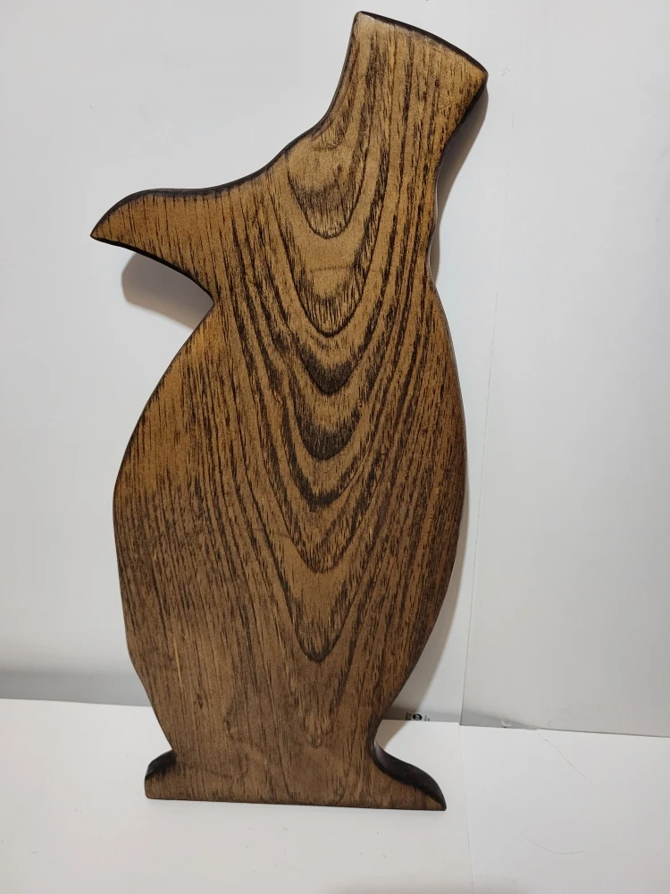 Here's a cute wooden penguin decoration! It measures about 18 inches tall and 7 inches wide at the base. It's a fun piece to add a bit of whimsy to any room.