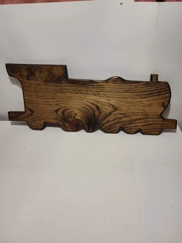 Here's a wooden train decoration! It's in great condition and ready to add some charm to your space. It measures approximately 29 inches long and 13 inches high.