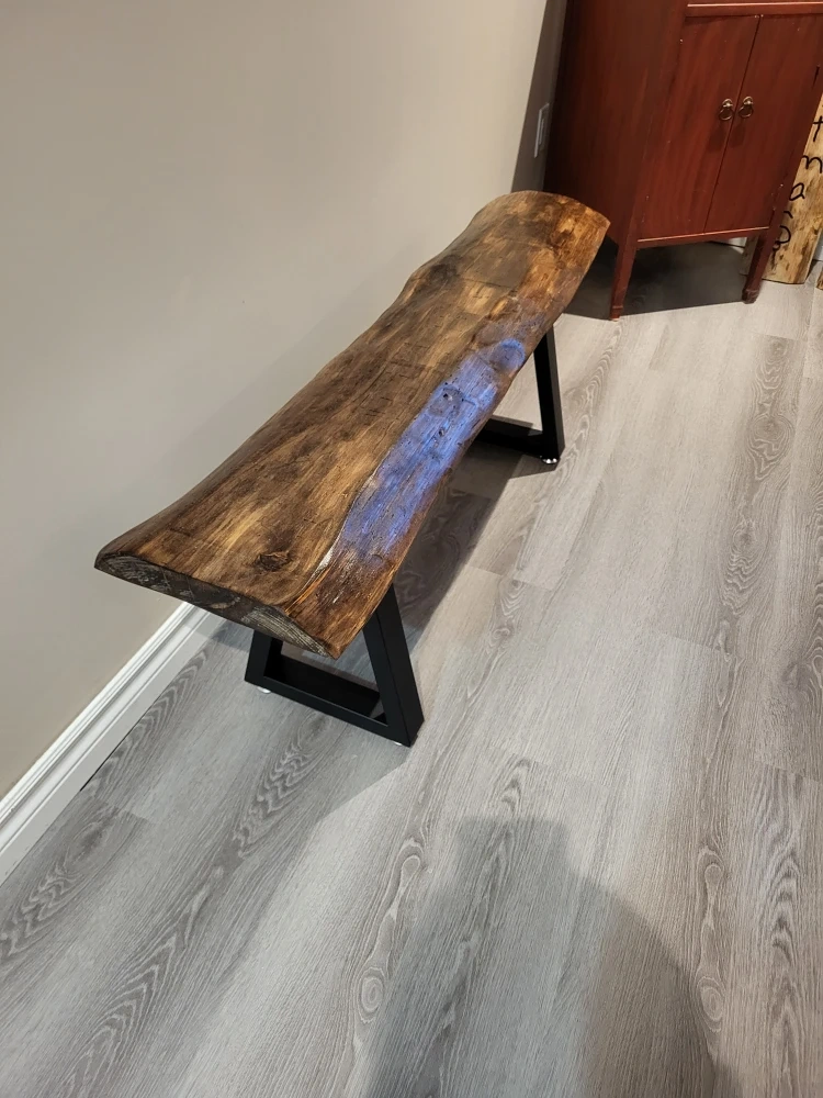 Here's a beautiful live edge wood bench! It measures approximately 4 feet in length. The wood has a lovely stained finish and sits on sturdy black metal legs. It would be a great addition to any entryway or living space.