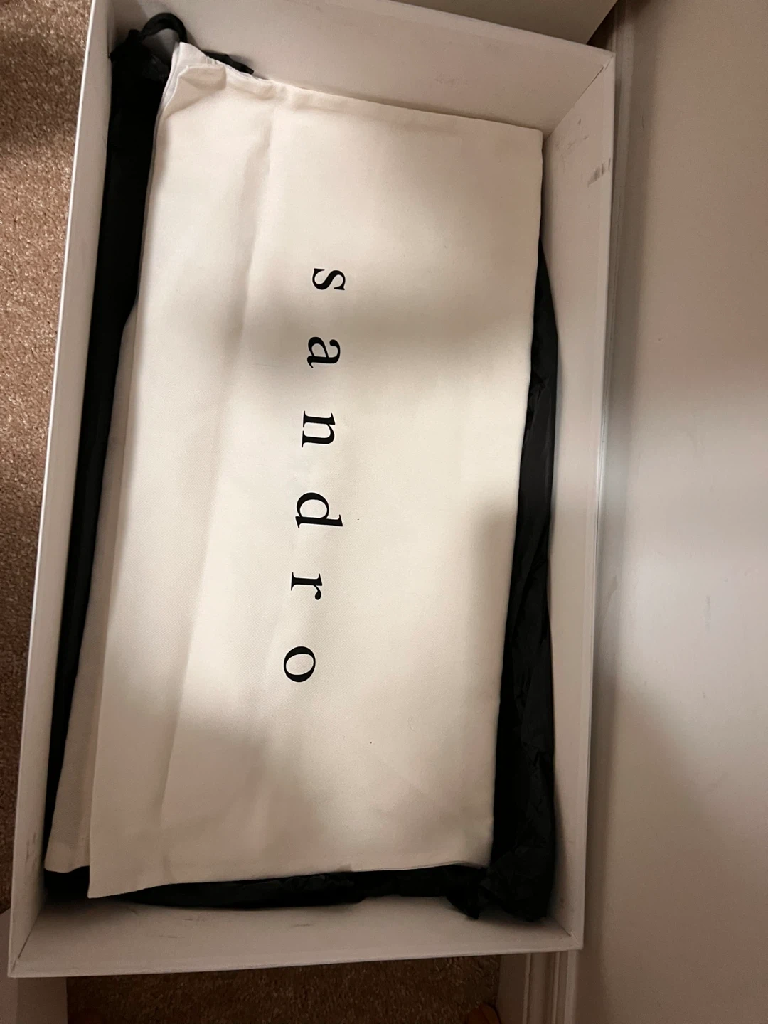 Selling a pair of Sandro black leather boots in size 37. They have a wooden block heel and rubber soles. The boots are in good condition and come with the original box!