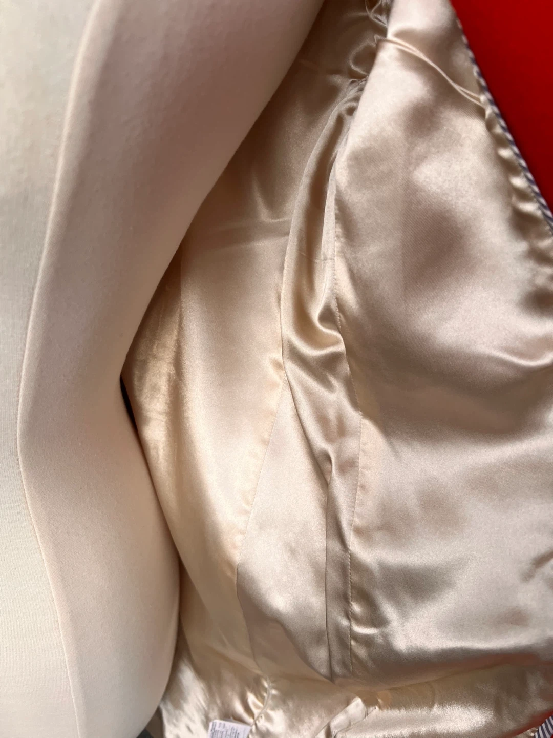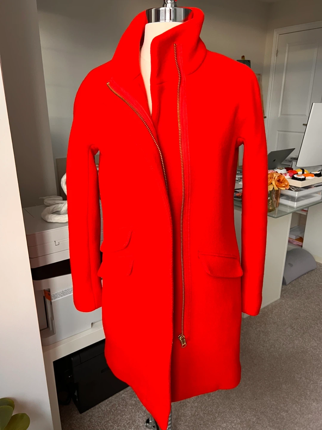 Here's a vibrant red coat from J. Crew! It's made with Italian Stadium Cloth by Nello Gori and is a size 00, but fits bigger. It's perfect for adding a pop of colour to your wardrobe