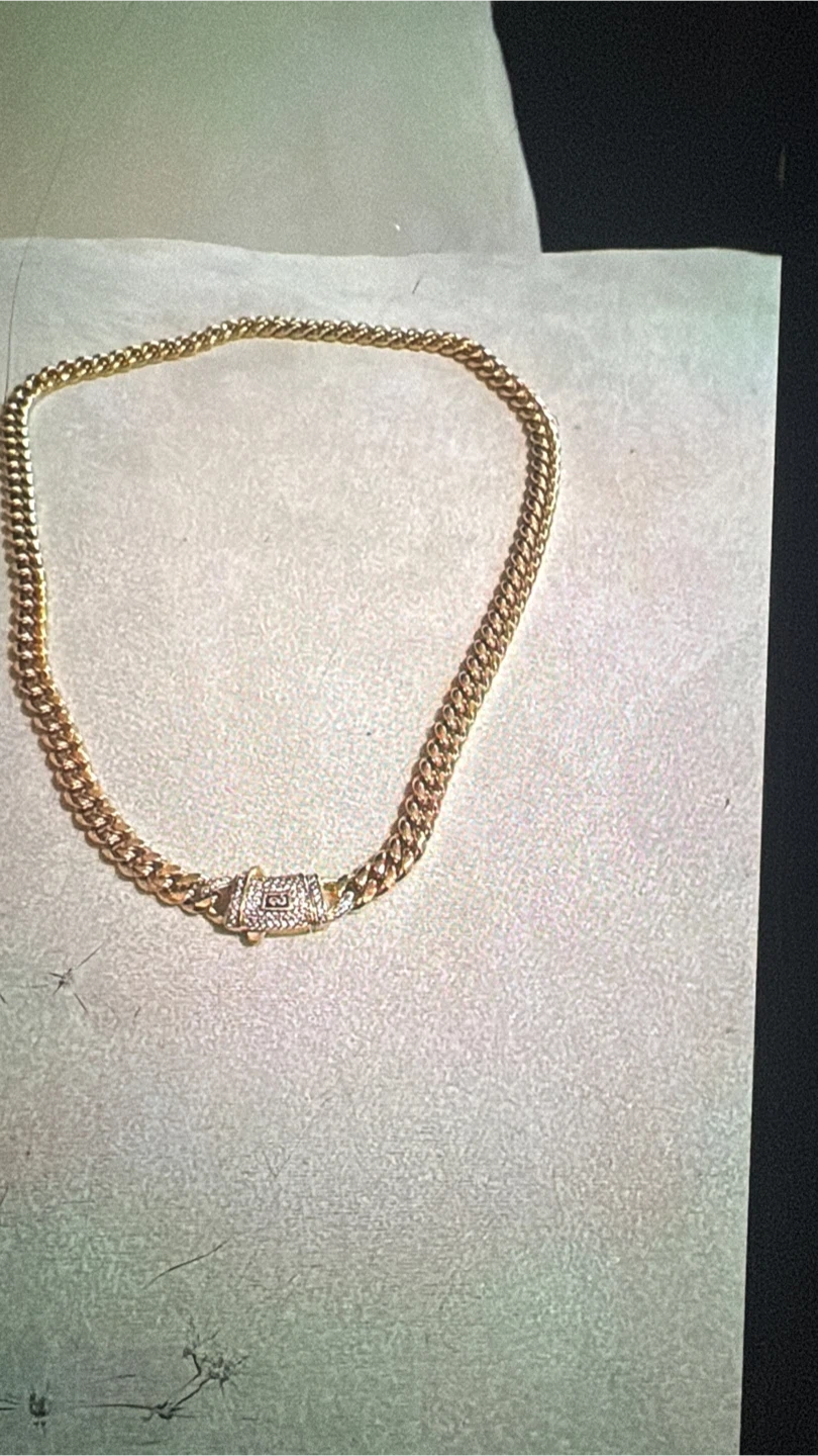 Selling a gold-tone Cuban link chain necklace. It features a detailed clasp. Perfect for adding a touch of style to any outfit!