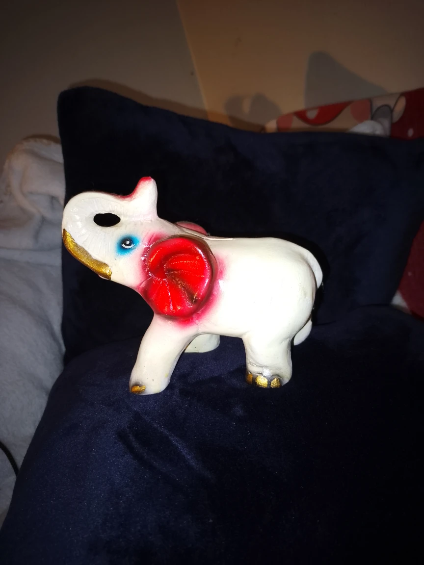 Here's a elephant coin bank! It's white with red and gold accents. It is in good condición,perfect for giving as a gift, as a living room decoration and to save coins
