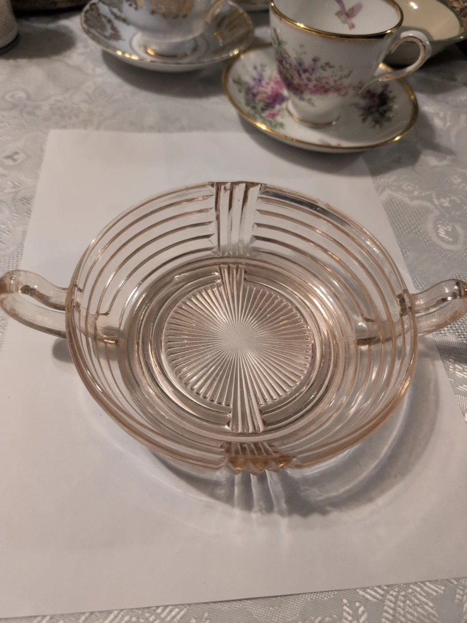This is a lovely vintage pink depression glass ashtray! It has a beautiful design and would make a great addition to any collection or a unique decorative piece for your home
