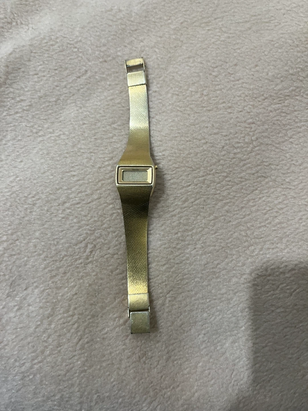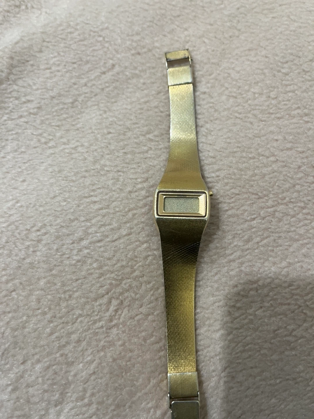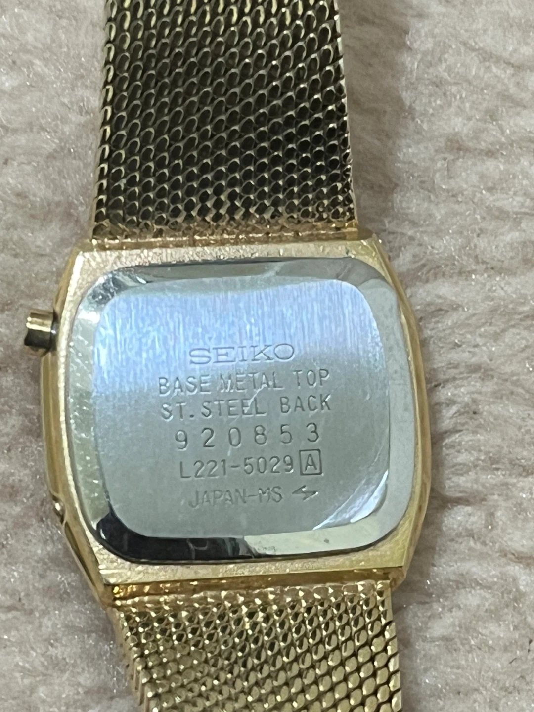 Selling a Seiko digital watch with a gold-tone finish. The model number is L221-5029. It has a stainless steel back and a base metal top.