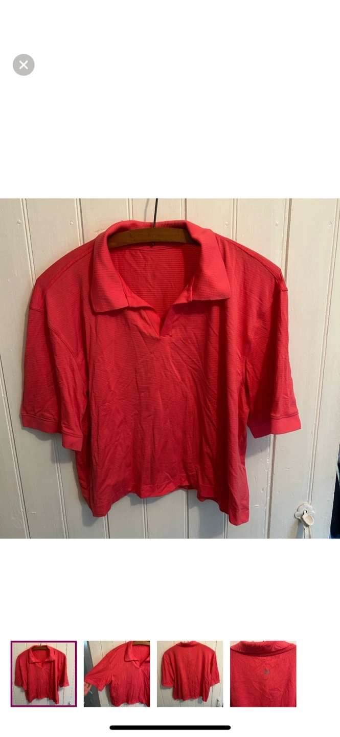 Lululemon brand. Short sleeve collard polo cropped top. Pink striped. No size dot, fits like 8/10. Brand new condition