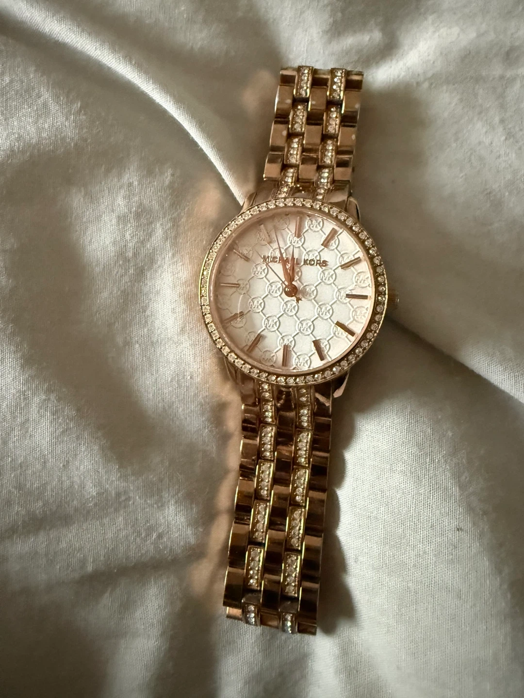 Selling a beautiful Michael Kors ladies watch. It's in great condition and features a stylish design with a rose gold tone and crystal accents. The watch face has the Michael Kors logo pattern. It would make a lovely addition to any outfit!