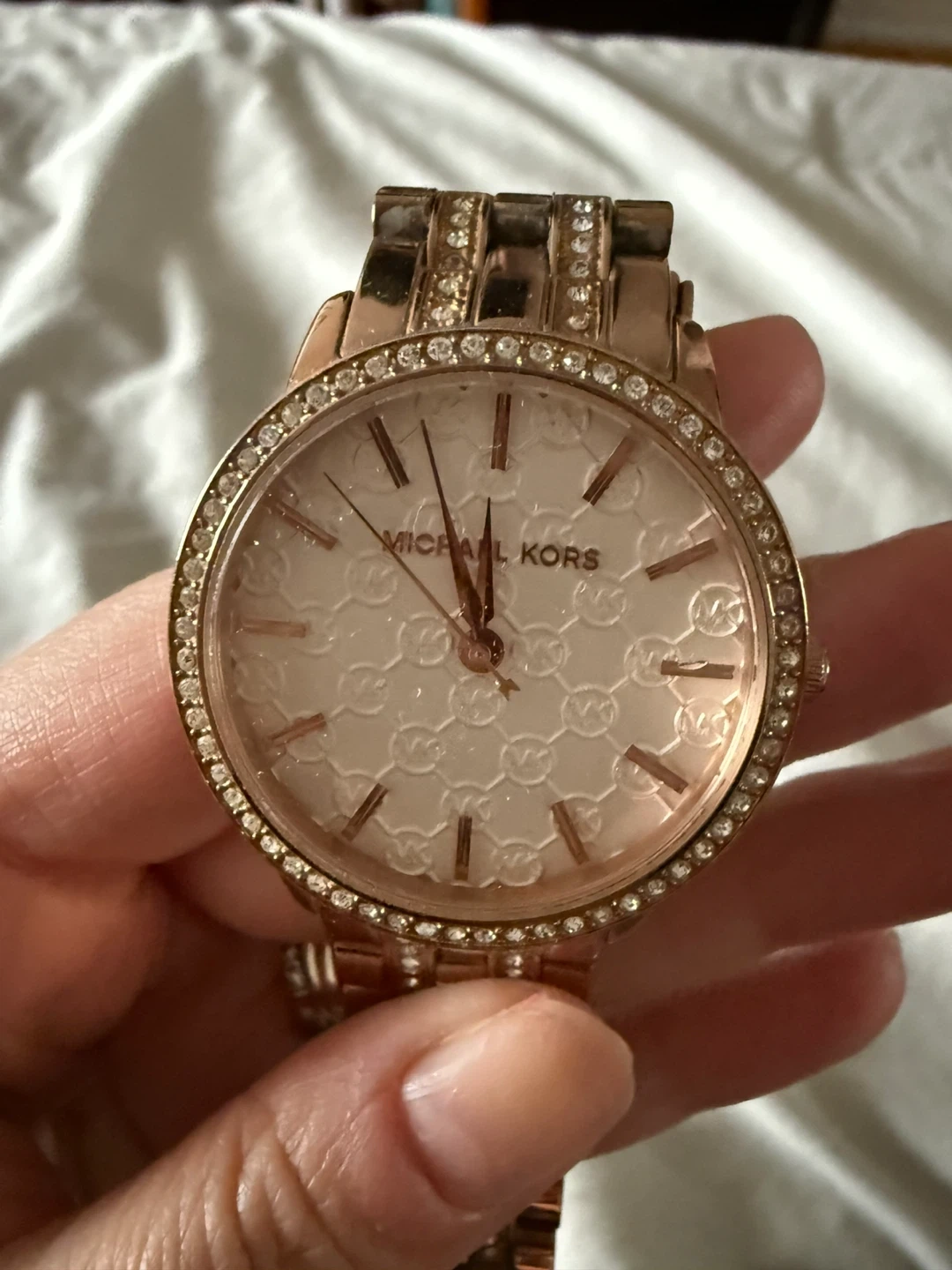 Selling a beautiful Michael Kors ladies watch. It's in great condition and features a stylish design with a rose gold tone and crystal accents. The watch face has the Michael Kors logo pattern. It would make a lovely addition to any outfit!