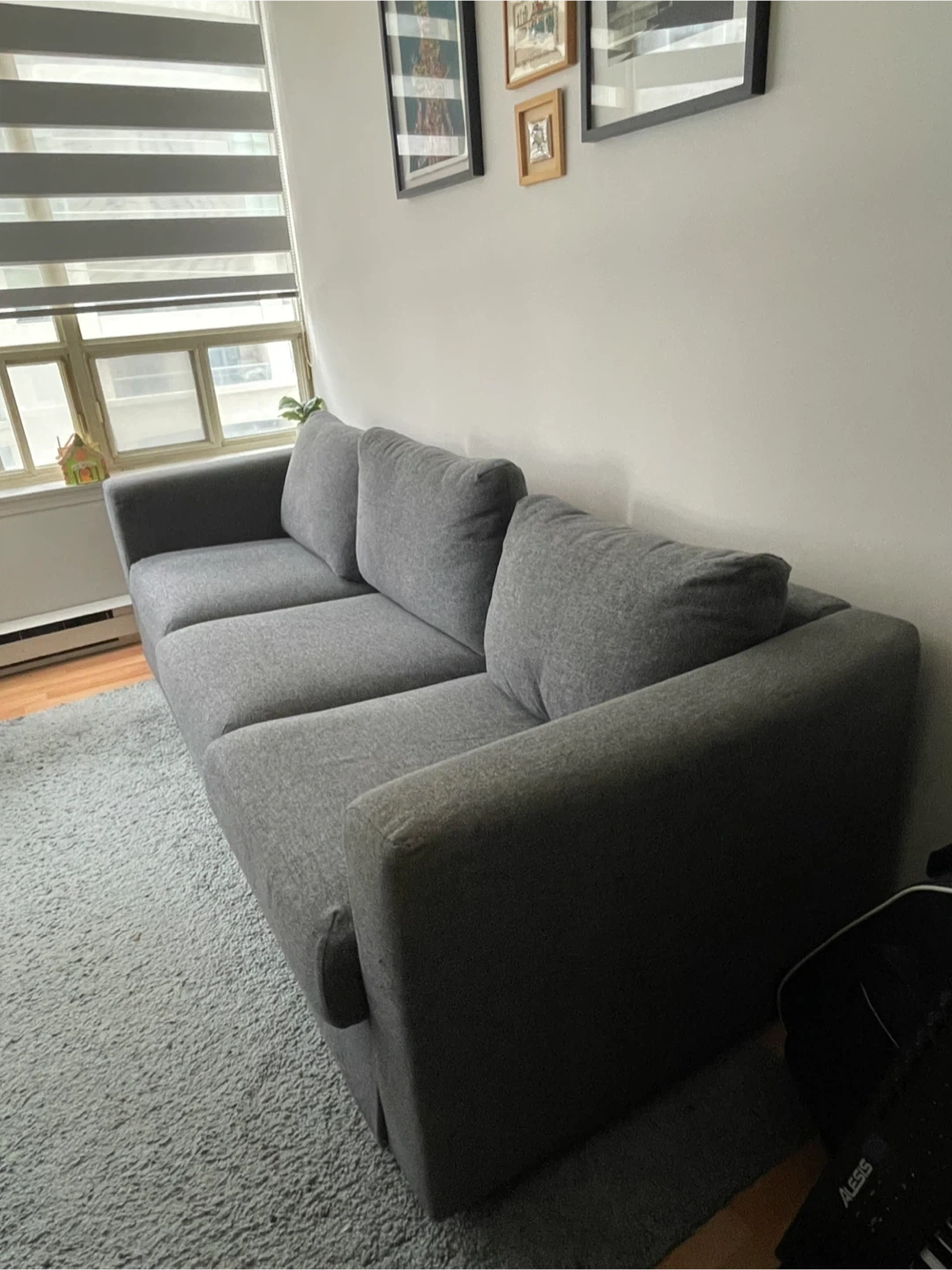 Selling a comfy grey sofa in good condition! It's a great piece for any living space. The cushions have zippers, making them easy to clean or replace the filling if needed. A simple and stylish addition to your home!