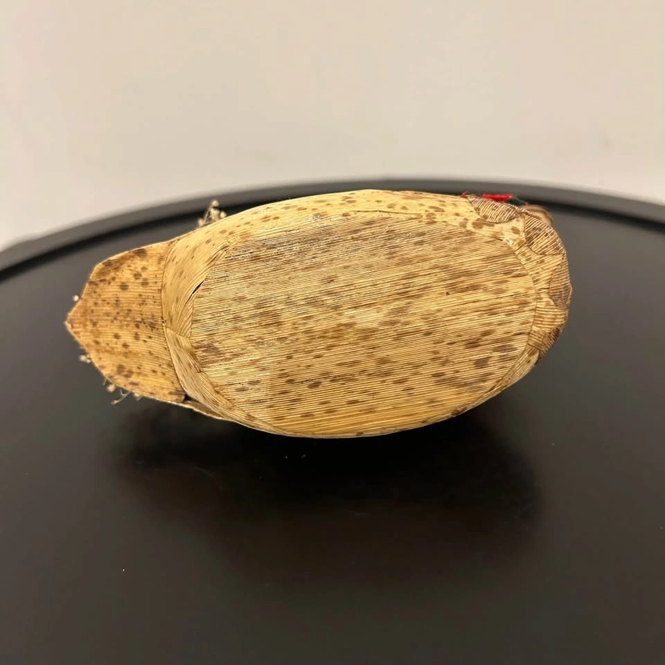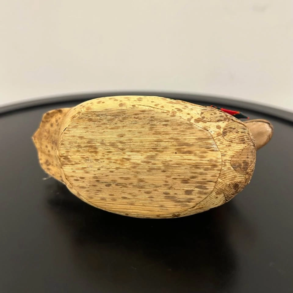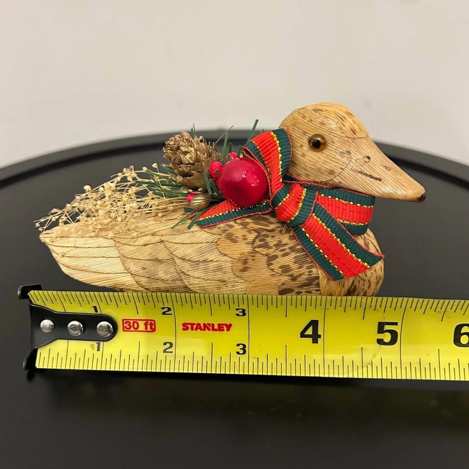 Charming hand-carved folk art duck made from natural straw material, beautifully shaped and detailed. Decorated with a festive bow, pinecone, berries, and dried floral elements — giving it a warm, rustic look. A lovely collectible accent for a cozy home interior or seasonal décor. Lightweight, decorative, and full of character.