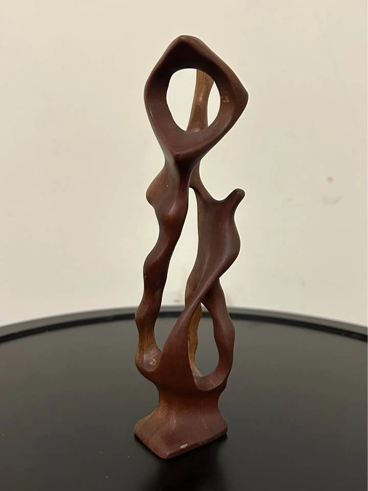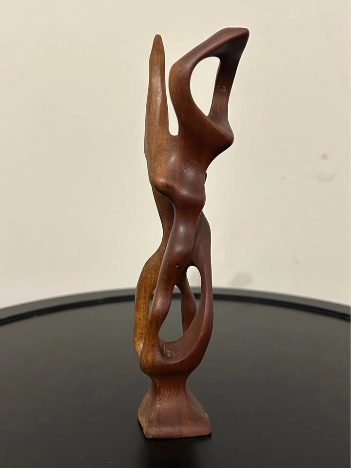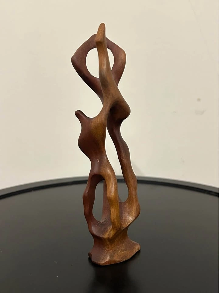 Elegant hand-carved abstract wooden sculpture featuring fluid, organic lines and an expressive mid-century modern form. This artisan piece captures movement and balance in a single continuous shape, making it an excellent collectible for lovers of minimalist art, MCM decor, and handcrafted wooden figures.