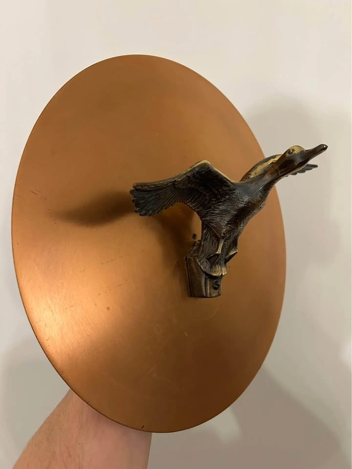 Vintage wall-mounted décor featuring a flying duck made from brass-coloured metal, set on a large round metal plate. Beautiful detailing on the wings and body. The backing plate shows light wear and patina from age.