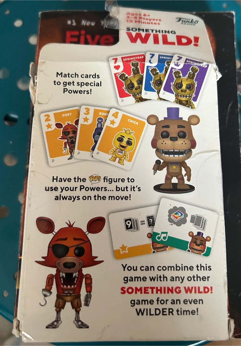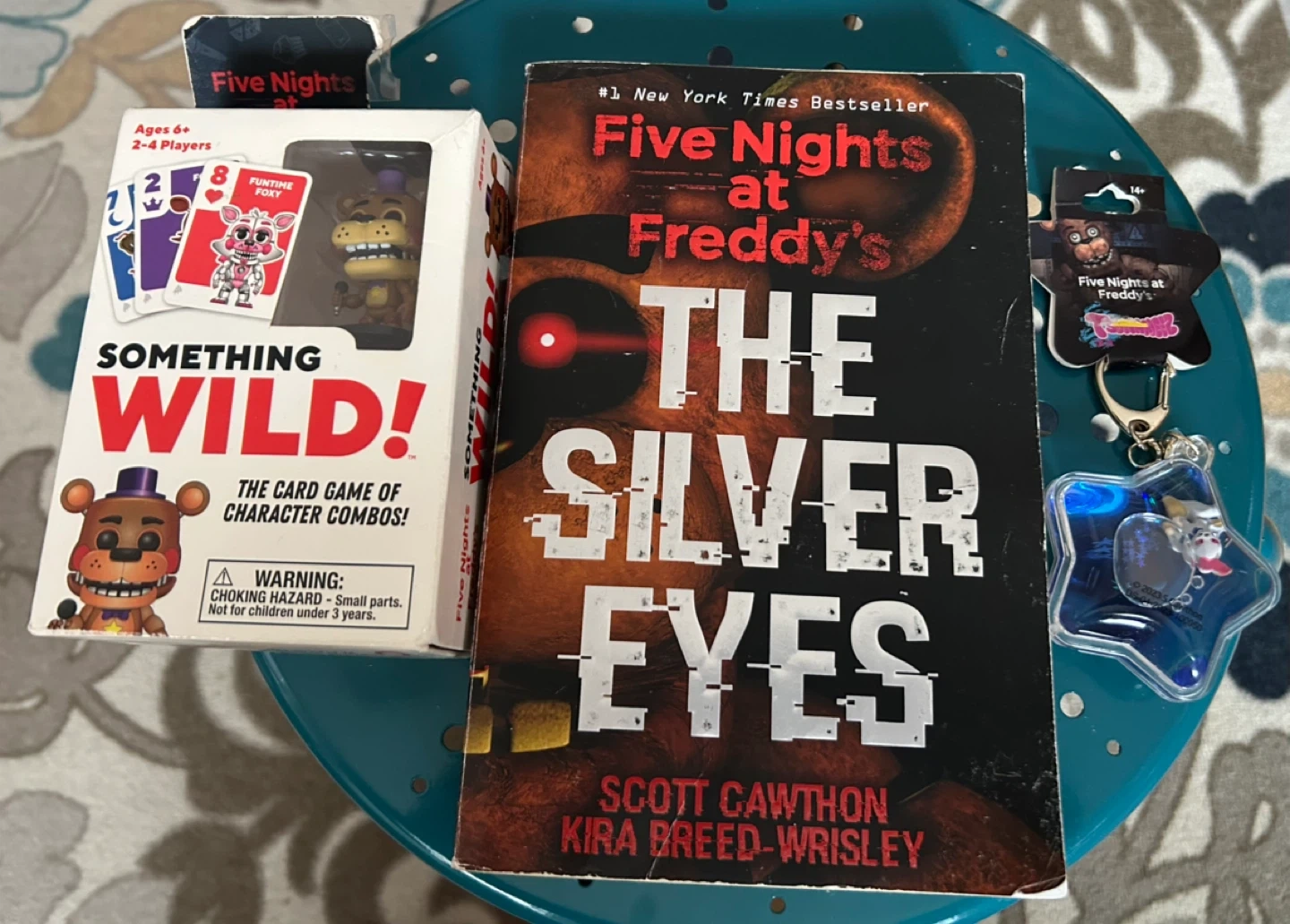 Selling a Five Nights at Freddy's bundle! This includes a used book "The Silver Eyes" by Scott Cawthon and Kira Breed-Wrisley, perfect for fans of the horror video game series. Also included is a new "Something Wild!" card game featuring characters from Five Nights at Freddy's, designed for 2-4 players ages 6+. The game combines card game of character combos also new key chain!