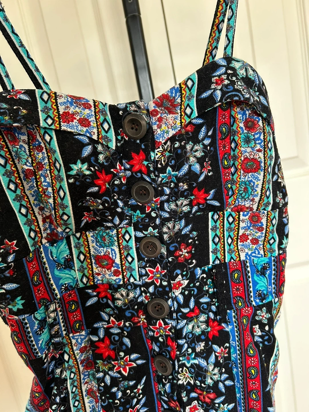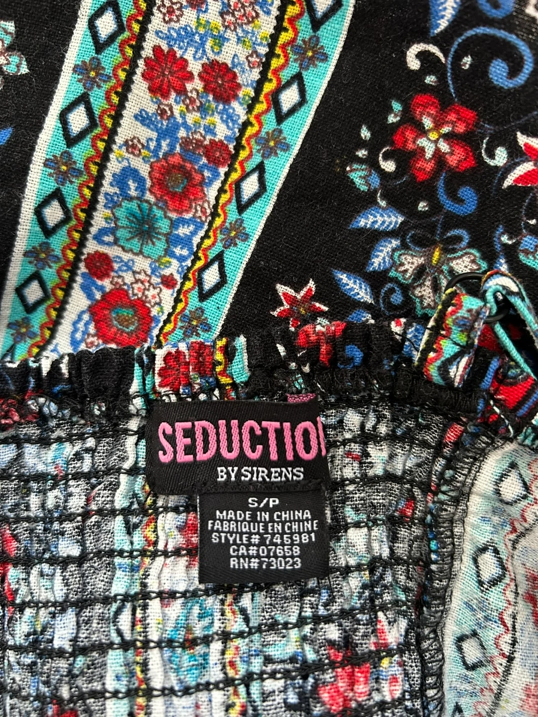 Cute Seduction by Sirens romper with a vibrant floral pattern! It's a size small and features adjustable straps and button-down front. Perfect for summer!