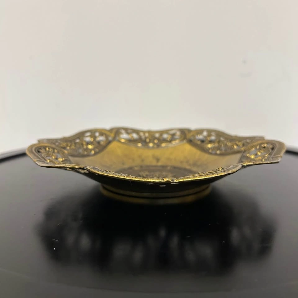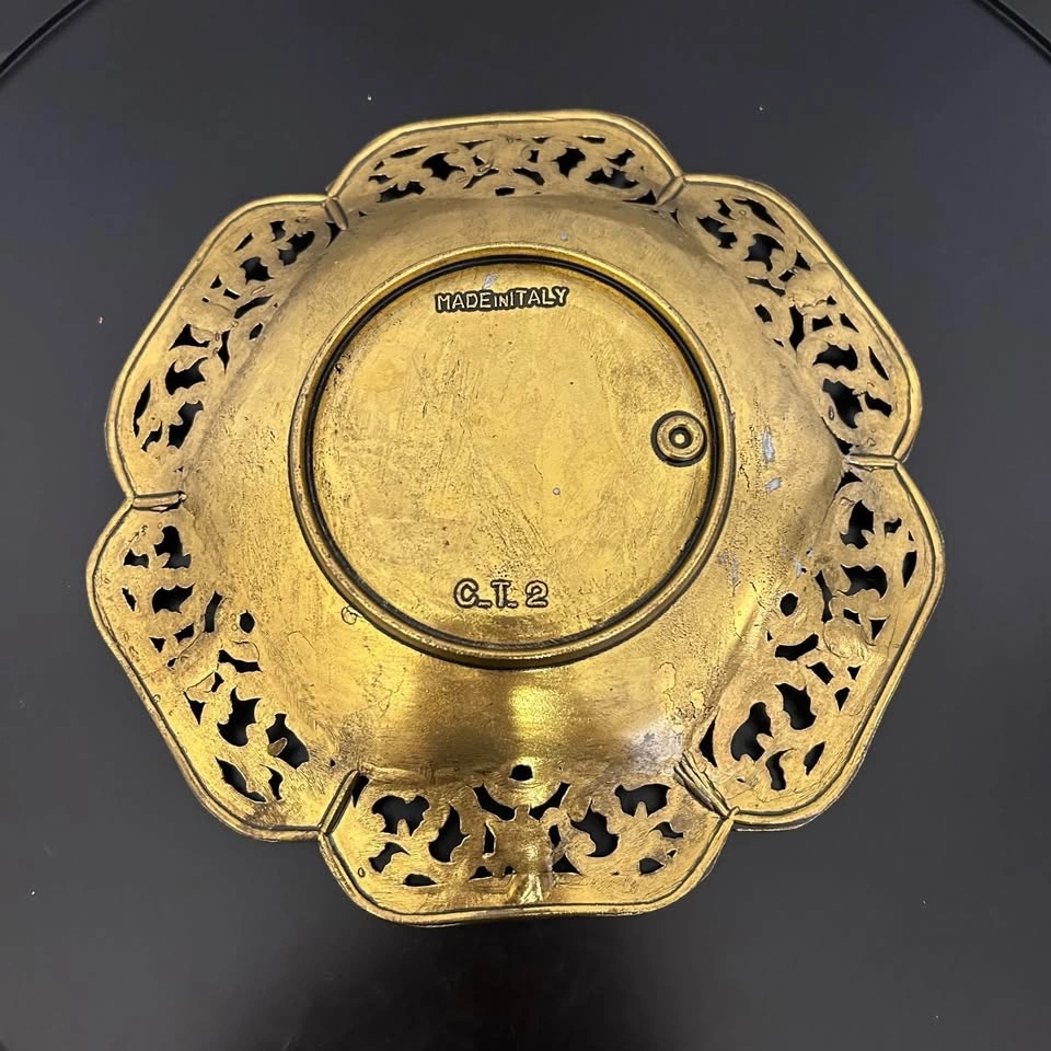 Beautiful vintage brass decorative plate made in Italy, featuring an ornate floral medallion and elegant pierced border. A lovely collectible accent piece with classic Italian craftsmanship and warm, aged patina. Perfect for décor, display, or as a small catchall tray.