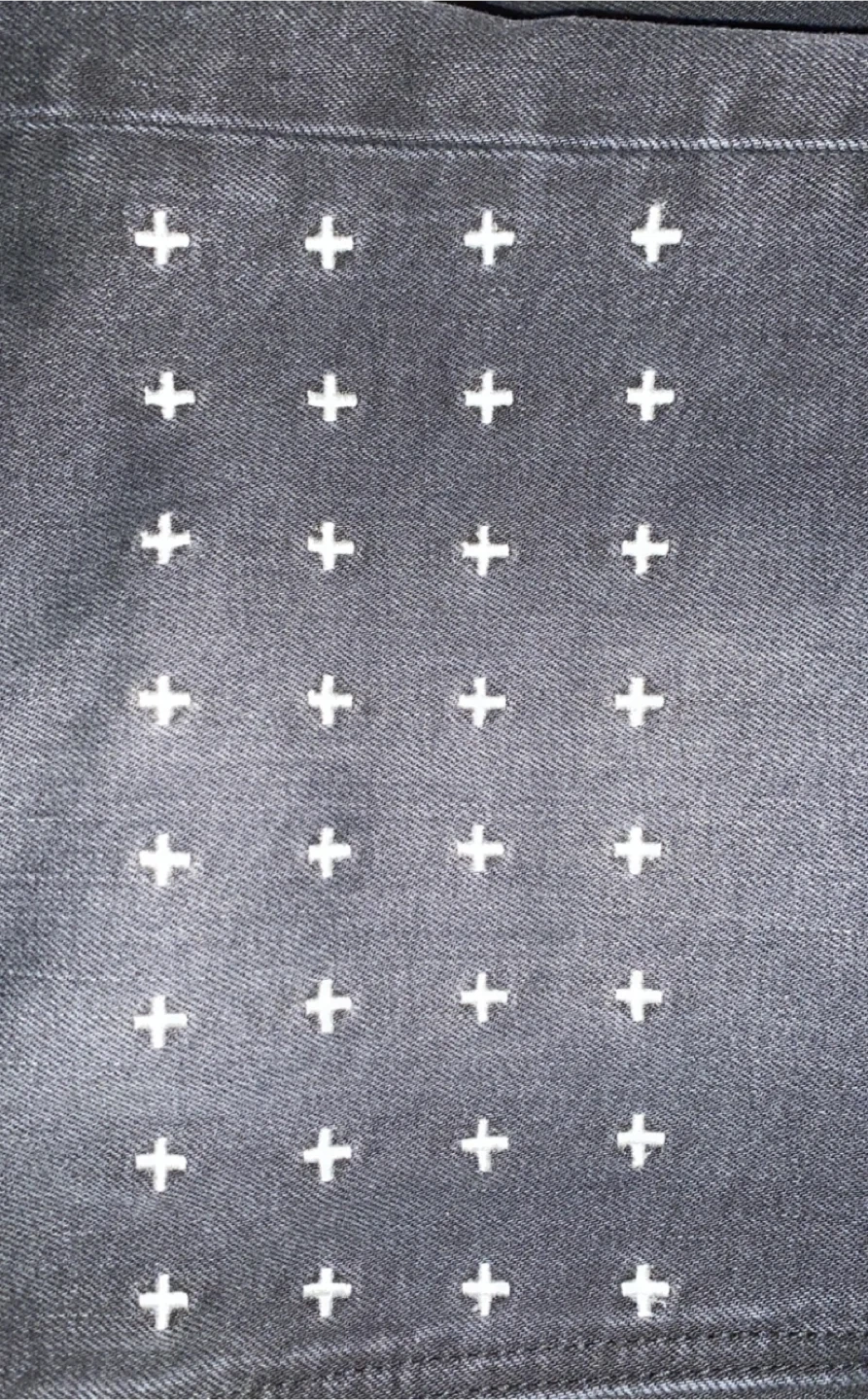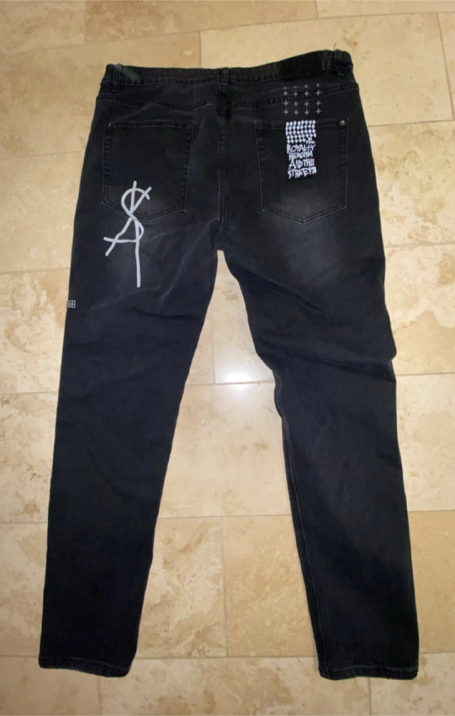 Selling a pair of Ksubi jeans with a unique design. Size 34 with no front tag. They're in good condition with some signs of wear and tear.
