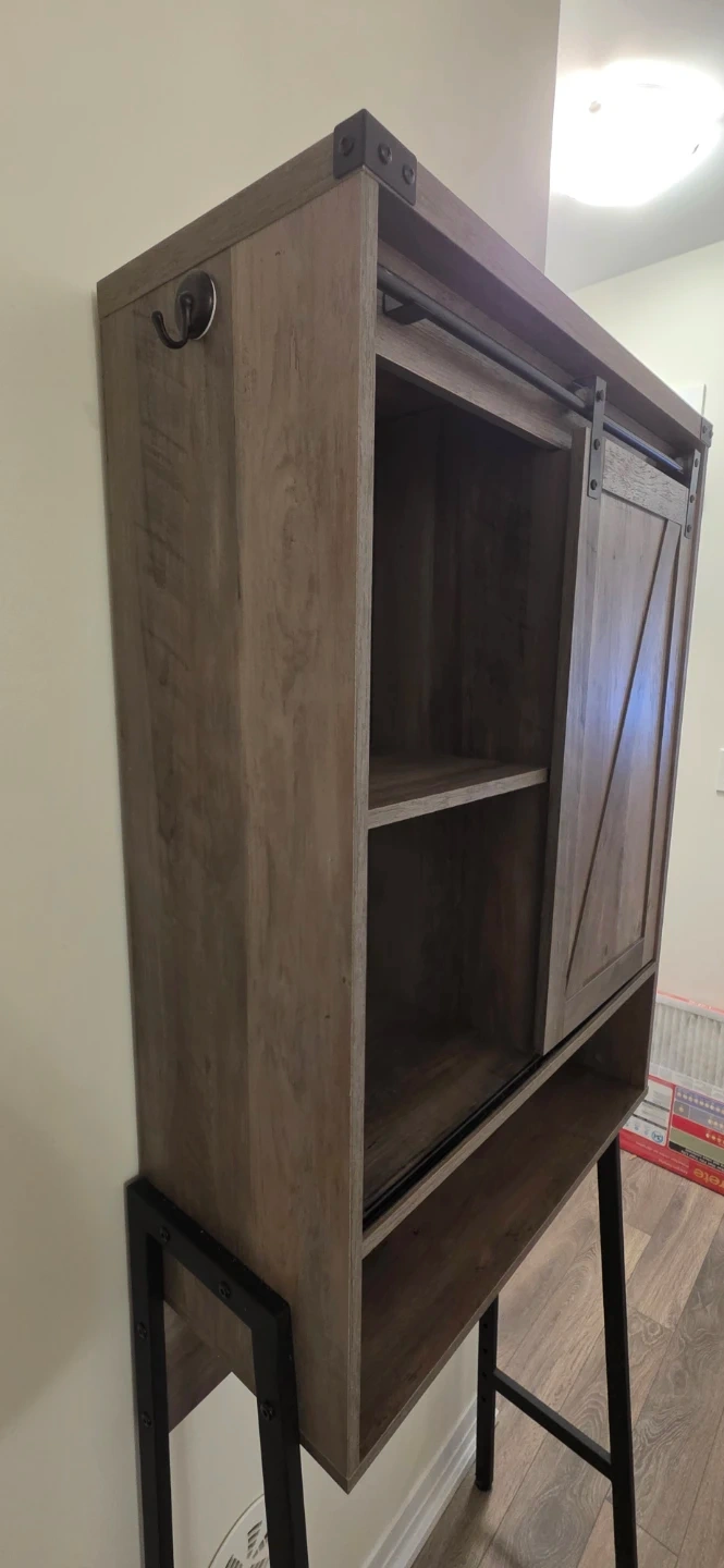 Selling a rustic-style over-the-toilet storage cabinet! It's perfect for adding some extra storage to your bathroom. The cabinet features a sliding barn door and open shelves.