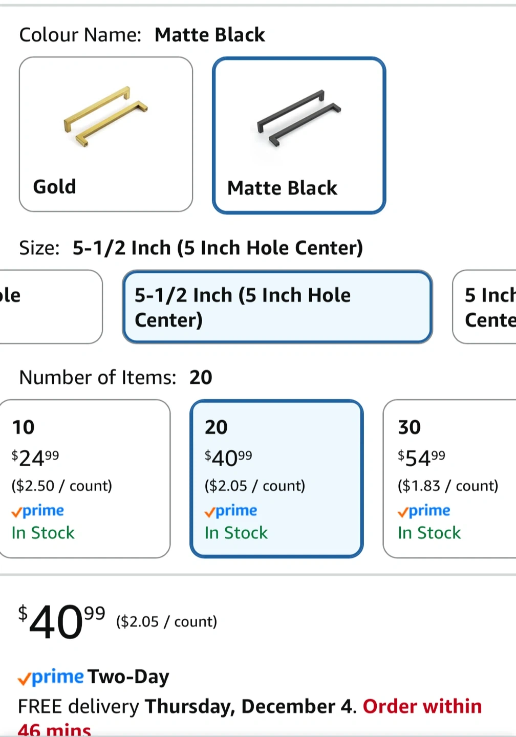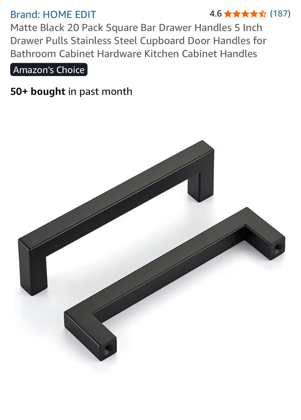Selling a 20 pack of HOME EDIT matte black bar drawer handles. These are 5-1/2 inch handles with a 5-inch hole center. They are stainless steel drawer pulls, perfect for bathroom or kitchen cabinet hardware. Includes all the hardware!