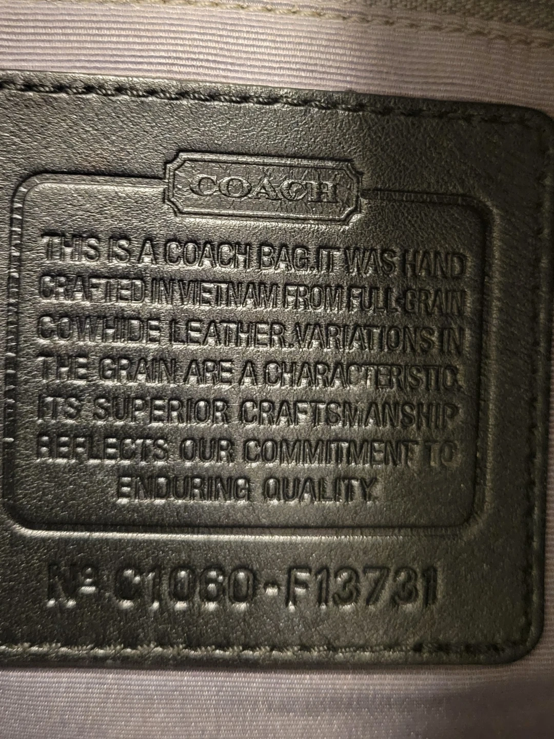This is a COACH bag, hand-crafted in Vietnam from full-grain cowhide leather. Variations in the grain are a characteristic of its superior craftsmanship. It features white contrast stitching and silver-tone hardware.