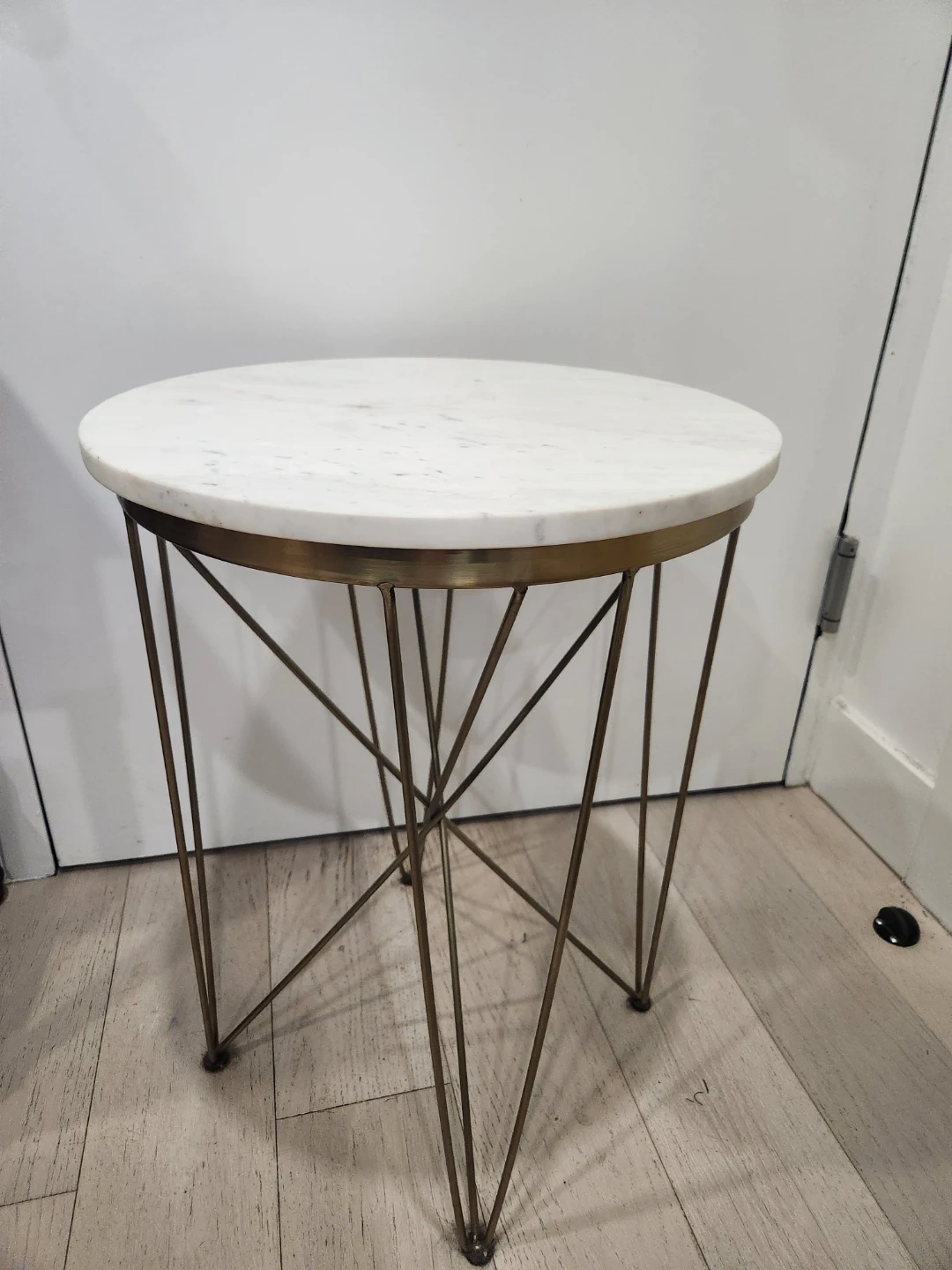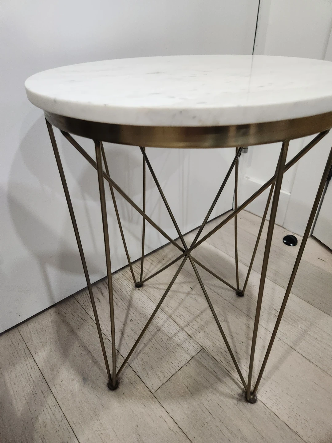 Round side table featuring a white marble top with subtle veining. It's supported by a stylish brass metal base with a geometric design. Tabletop is made of marble, base is metal.
