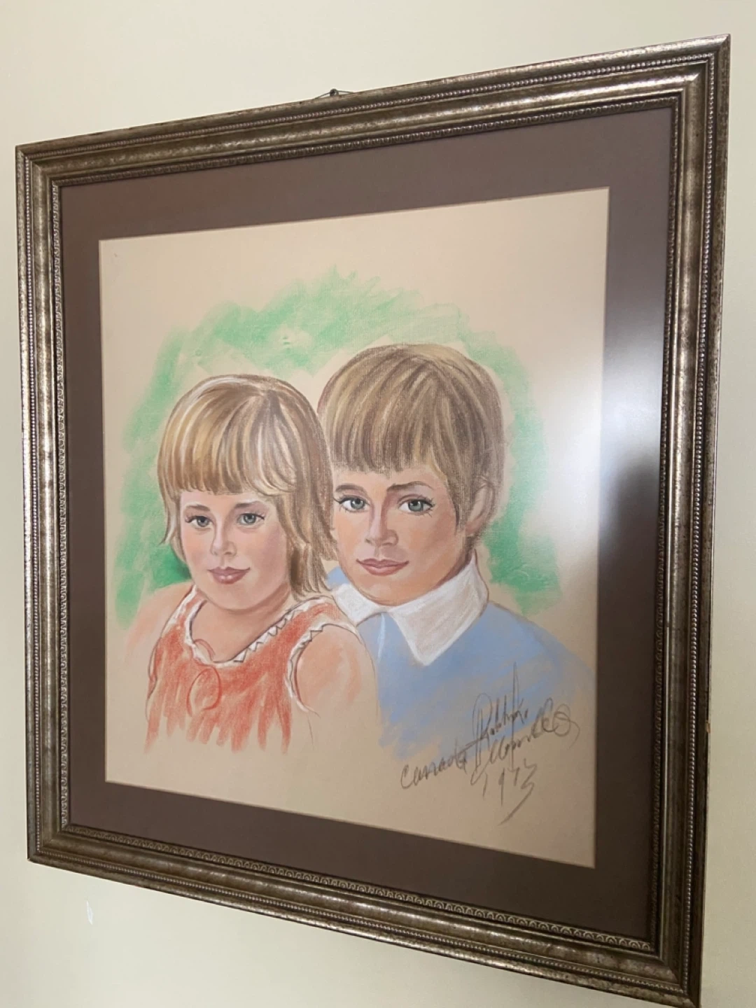A framed pastel portrait depicts two children. The artwork is signed and dated 1973 Montreal . It's a lovely piece for any home looking for a touch of vintage charm.