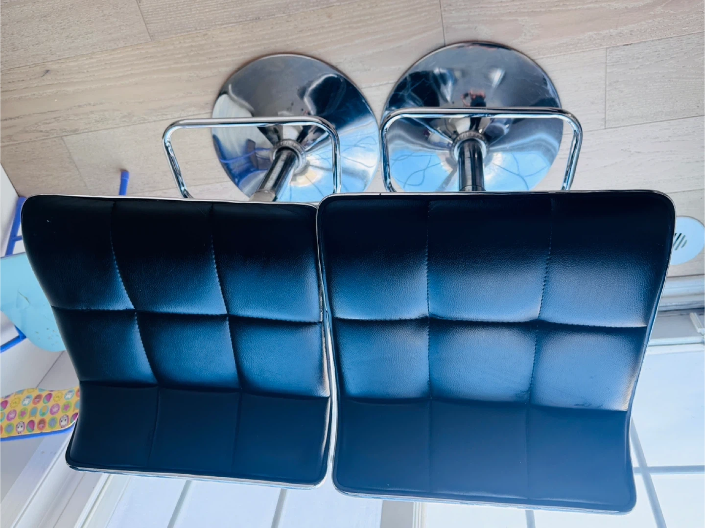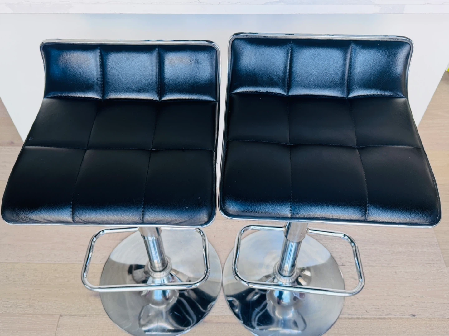 A set of two adjustable bar stools. They're upholstered in black faux leather with a chrome base and adjustable height feature. They have a footrest for added comfort. No rip no tear good condition
