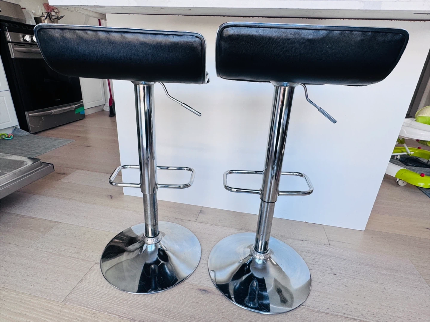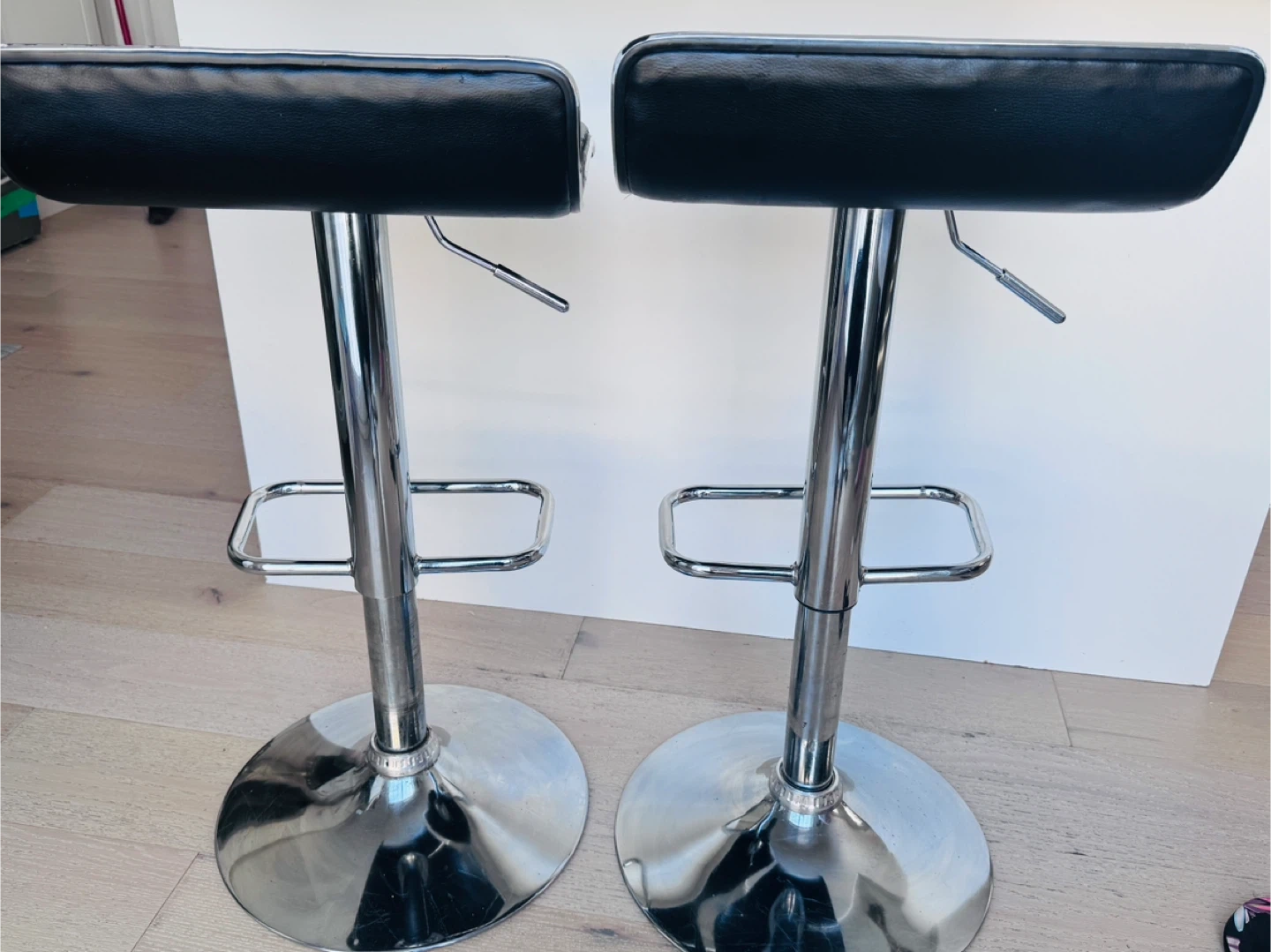 A set of two adjustable bar stools. They're upholstered in black faux leather with a chrome base and adjustable height feature. They have a footrest for added comfort. No rip no tear good condition