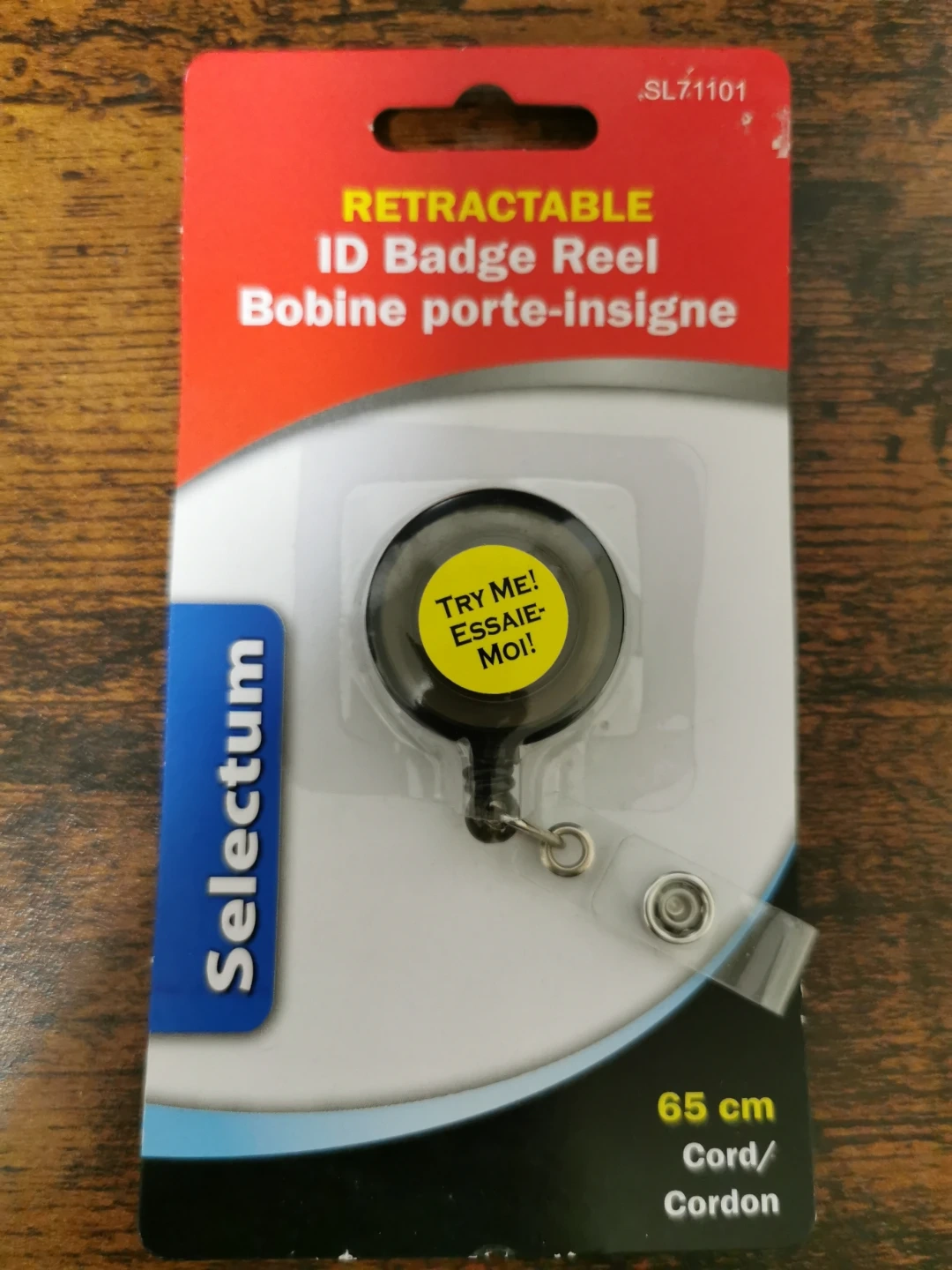 This is a Selectum retractable ID badge reel. It has a cord length of 65 cm. It's useful for easily accessing your ID or access card throughout the day.
