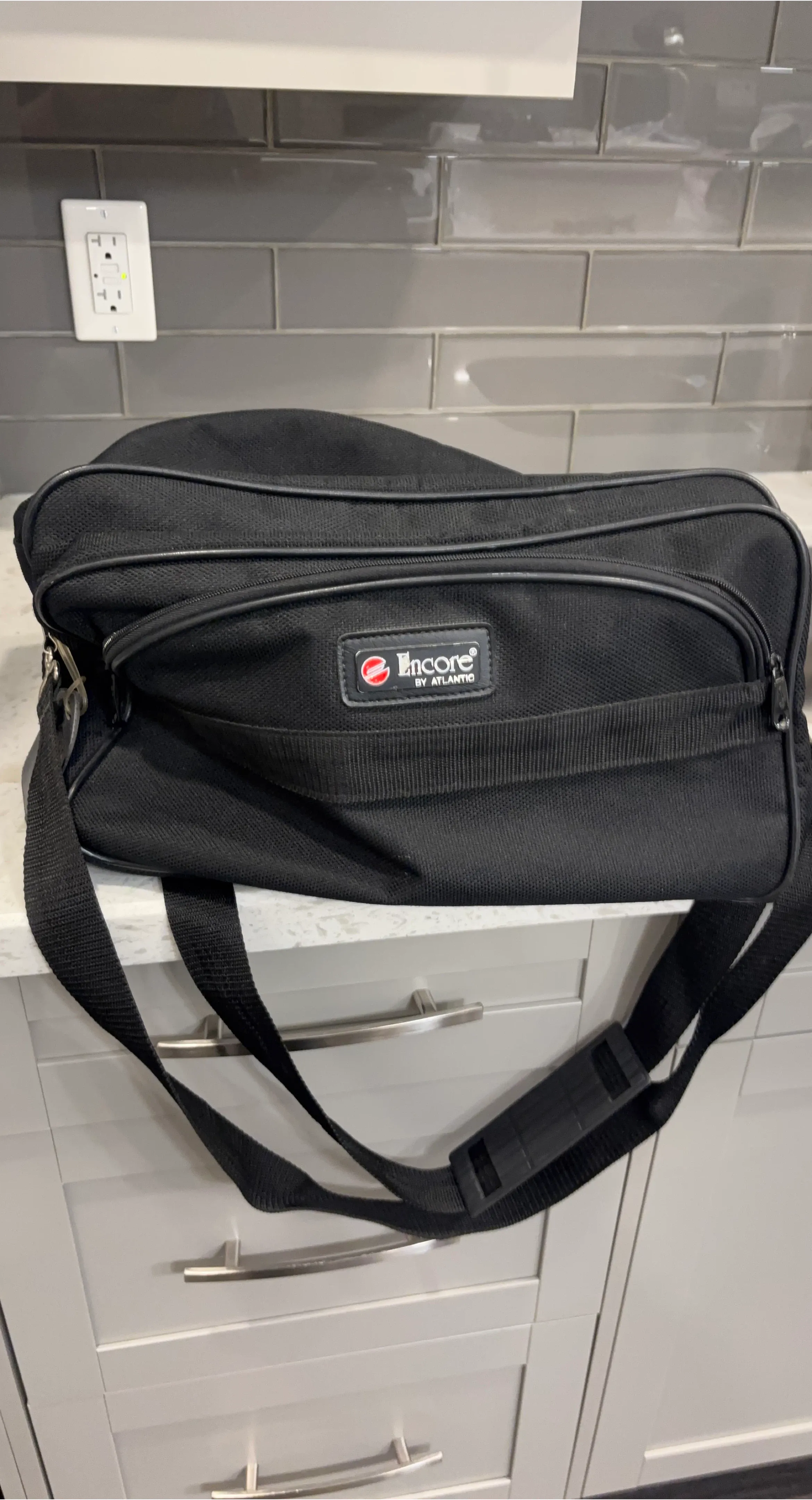 This is a black duffle bag by Encore by Atlantic. It features a durable fabric construction and an adjustable shoulder strap. It has multiple zipper compartments for storage.