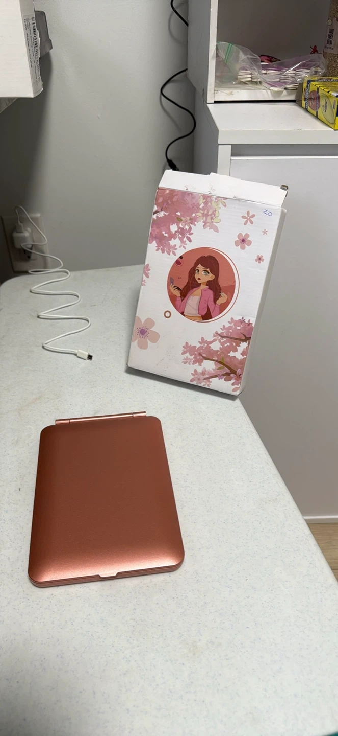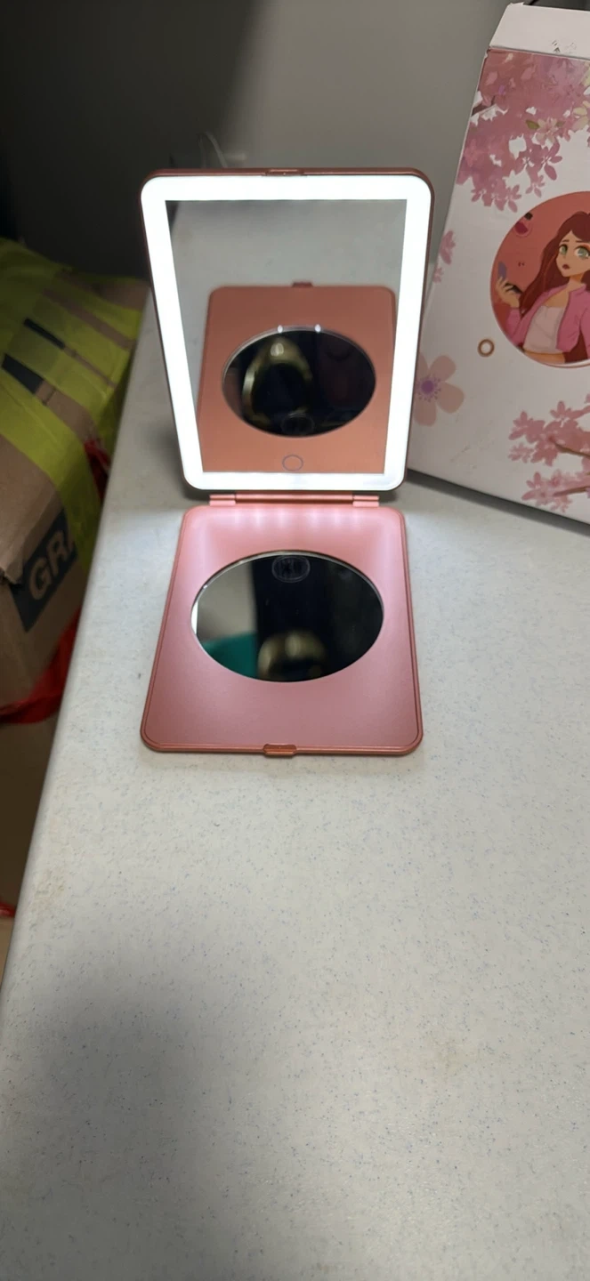 This rose gold foldable makeup mirror features bright LED lights for clear visibility. It includes a secondary magnifying mirror on the inside cover. Comes with a USB charging cable.