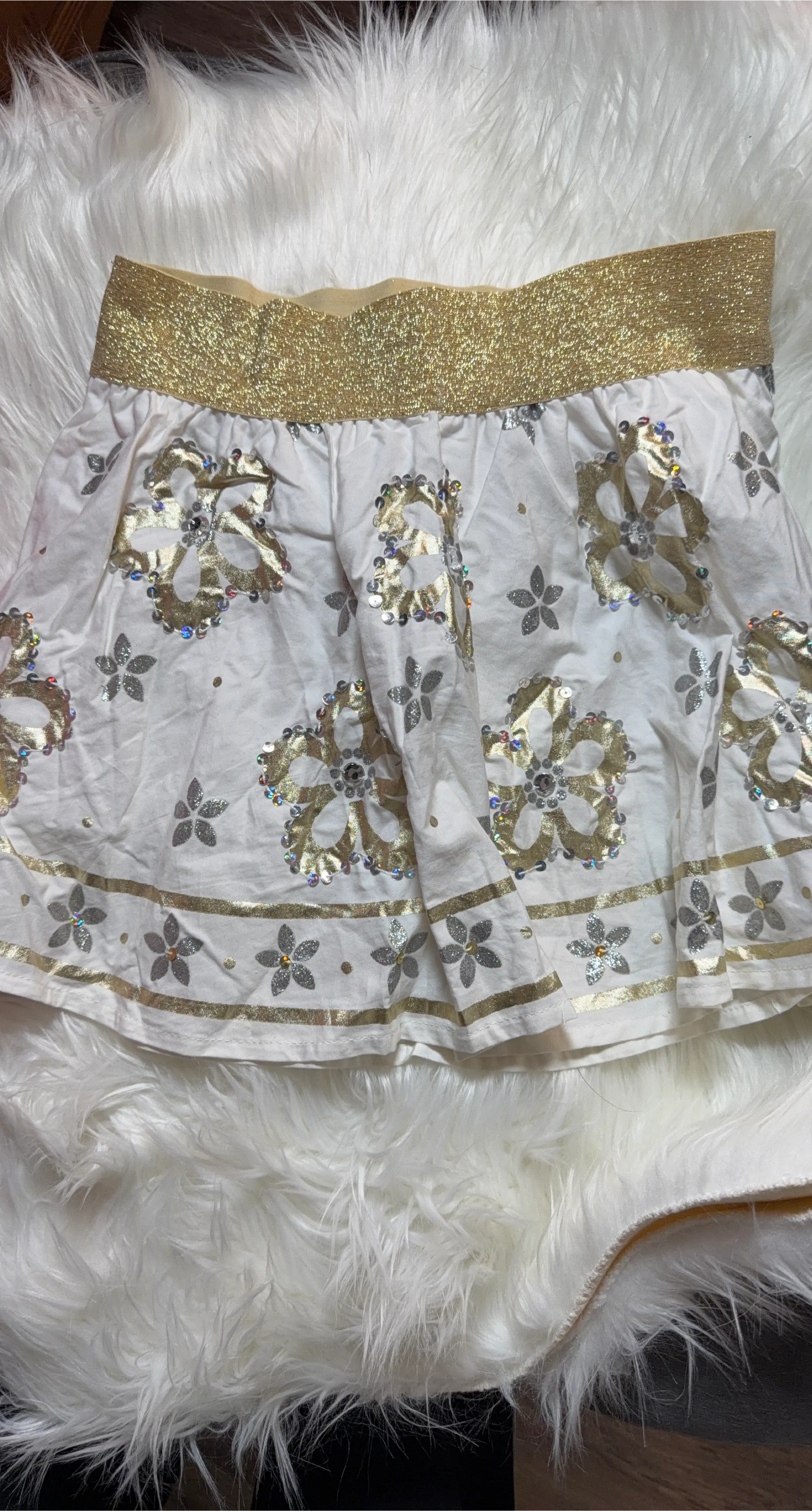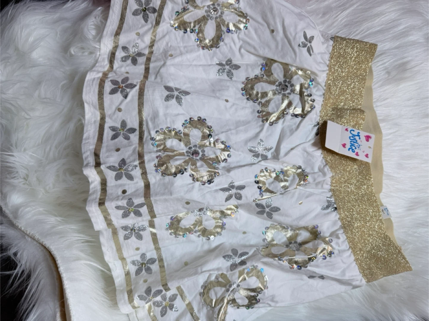 This white skirt from Justice features a sparkly gold floral print with sequin accents. It's a size 12 and made of 100% cotton. The elastic waistband is also detailed with gold shimmer.