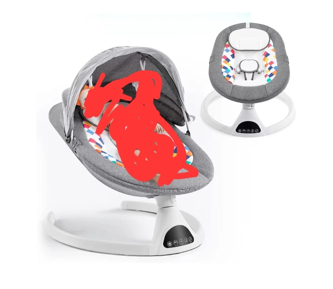 Grey baby rocker seat with a colourful patterned insert and a detachable canopy. It has a white base and features multiple control buttons. This rocker offers a comfortable place for a baby to rest and play. It's suitable for infants. Remote control available.