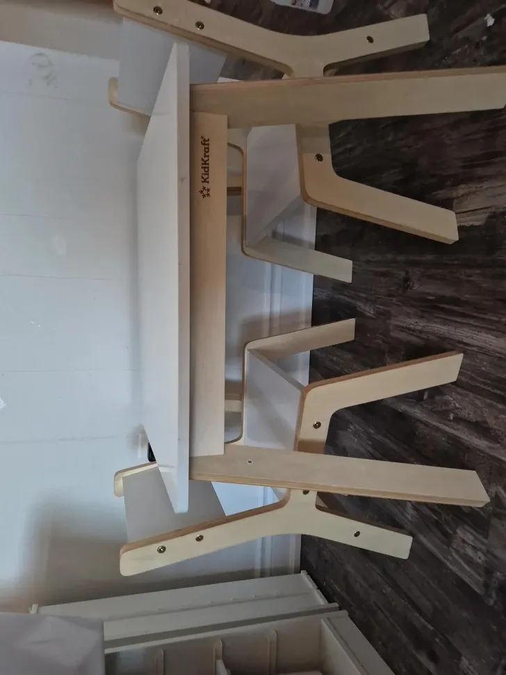 This KidKraft activity table is made of wood with white and natural wood finishes. It's designed for kids' activities and crafts. This table is a great addition to a play area!