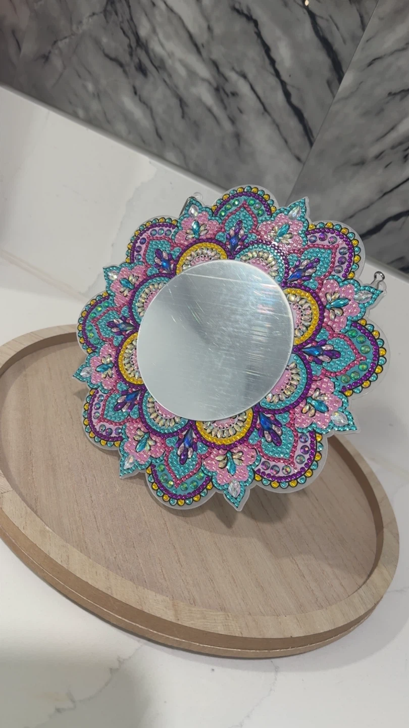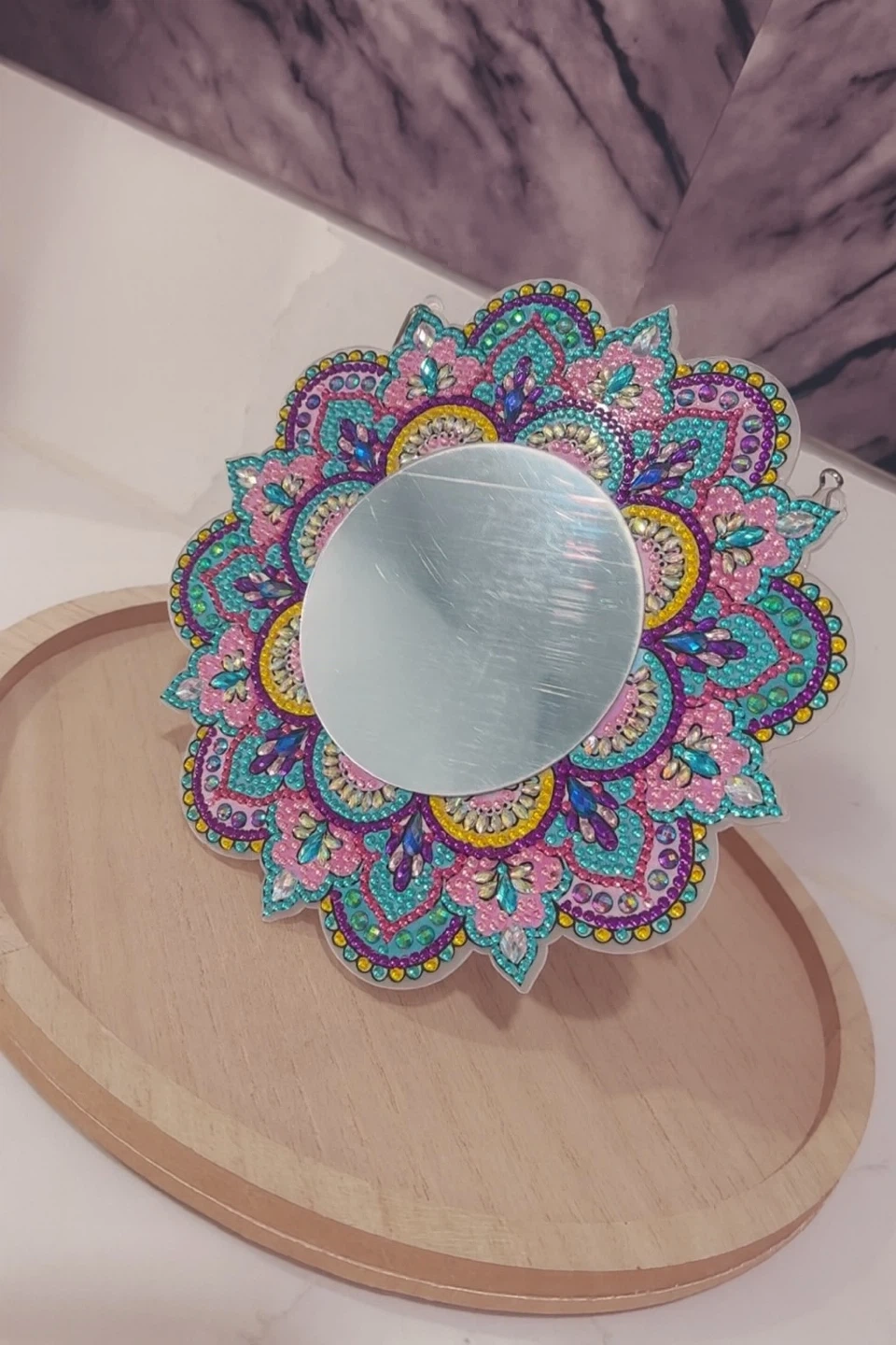 A unique mirror featuring a colourful mandala design. It's decorated with tiny, sparkling pieces. This decorative mirror adds a pop of colour to any room!