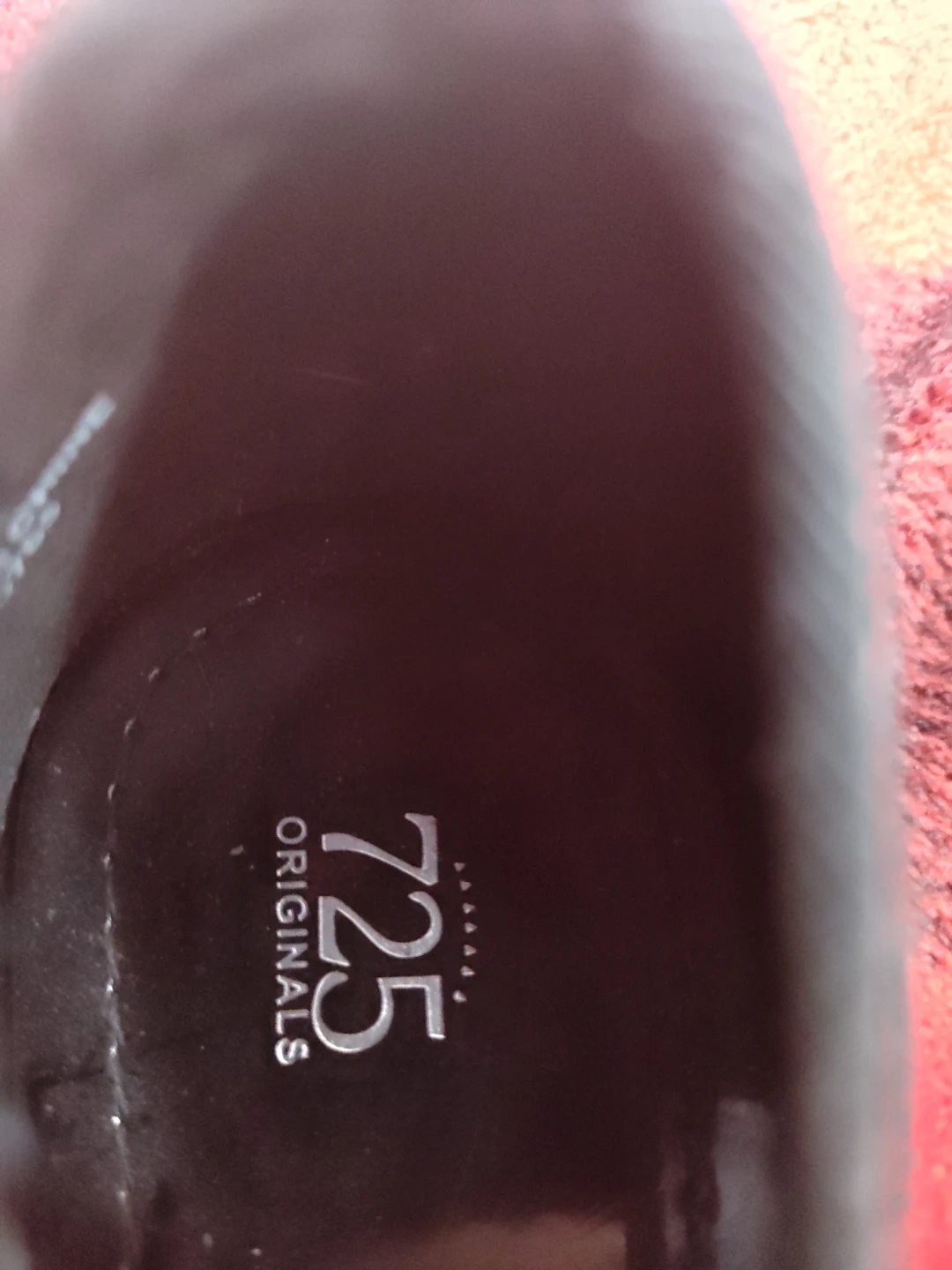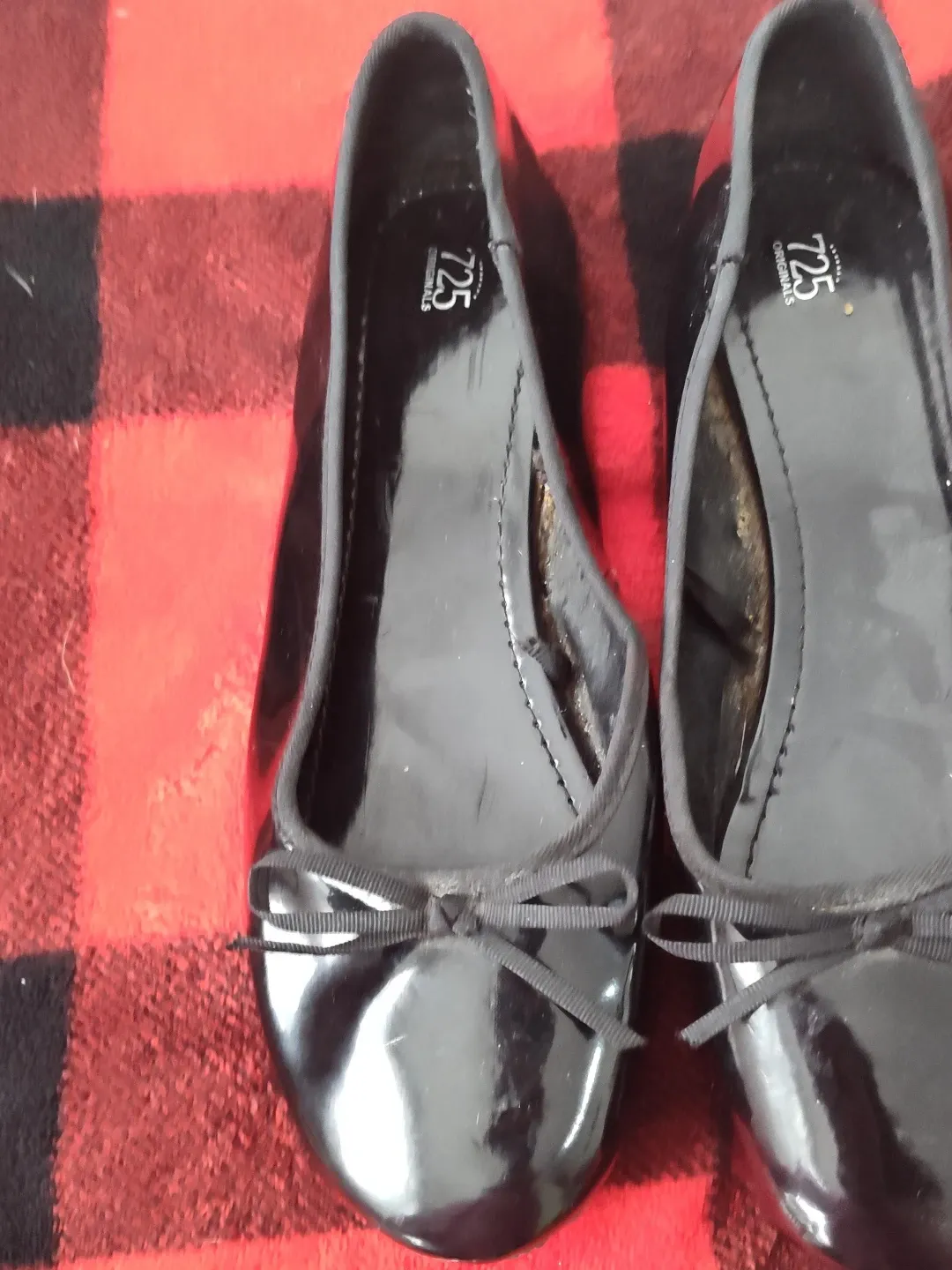 These 725 ORIGINALS ballet flats are a classic black patent style. They feature a small bow detail at the toe. The interior shows some signs of wear, but the exterior remains shiny. These flats are suitable for casual wear or dressing up an outfit.