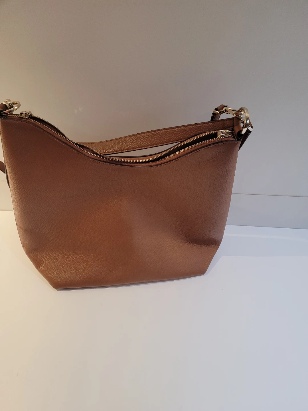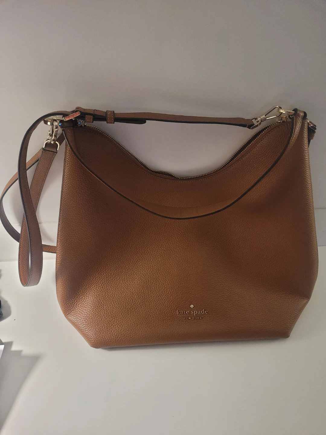 This is a stylish brown leather hobo shoulder bag from Kate Spade. It's made of genuine leather and features a comfortable strap. The interior is lined with the signature Kate Spade spade pattern. It's a great everyday bag for essentials!