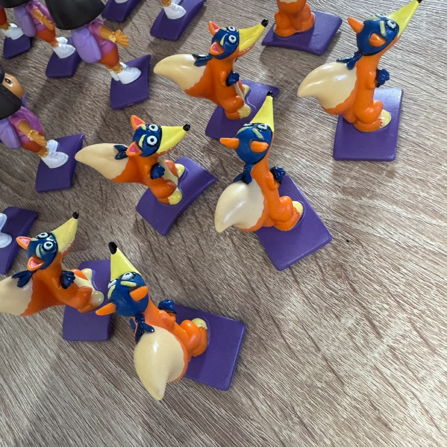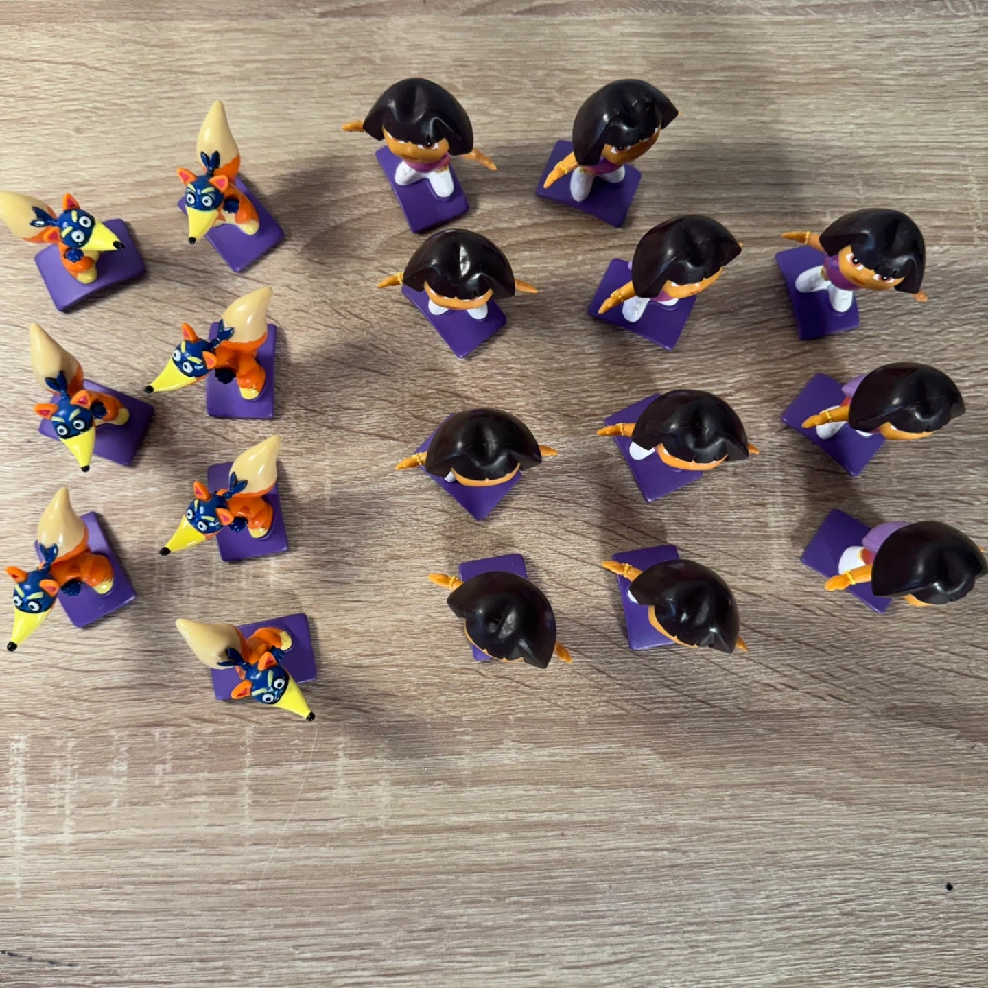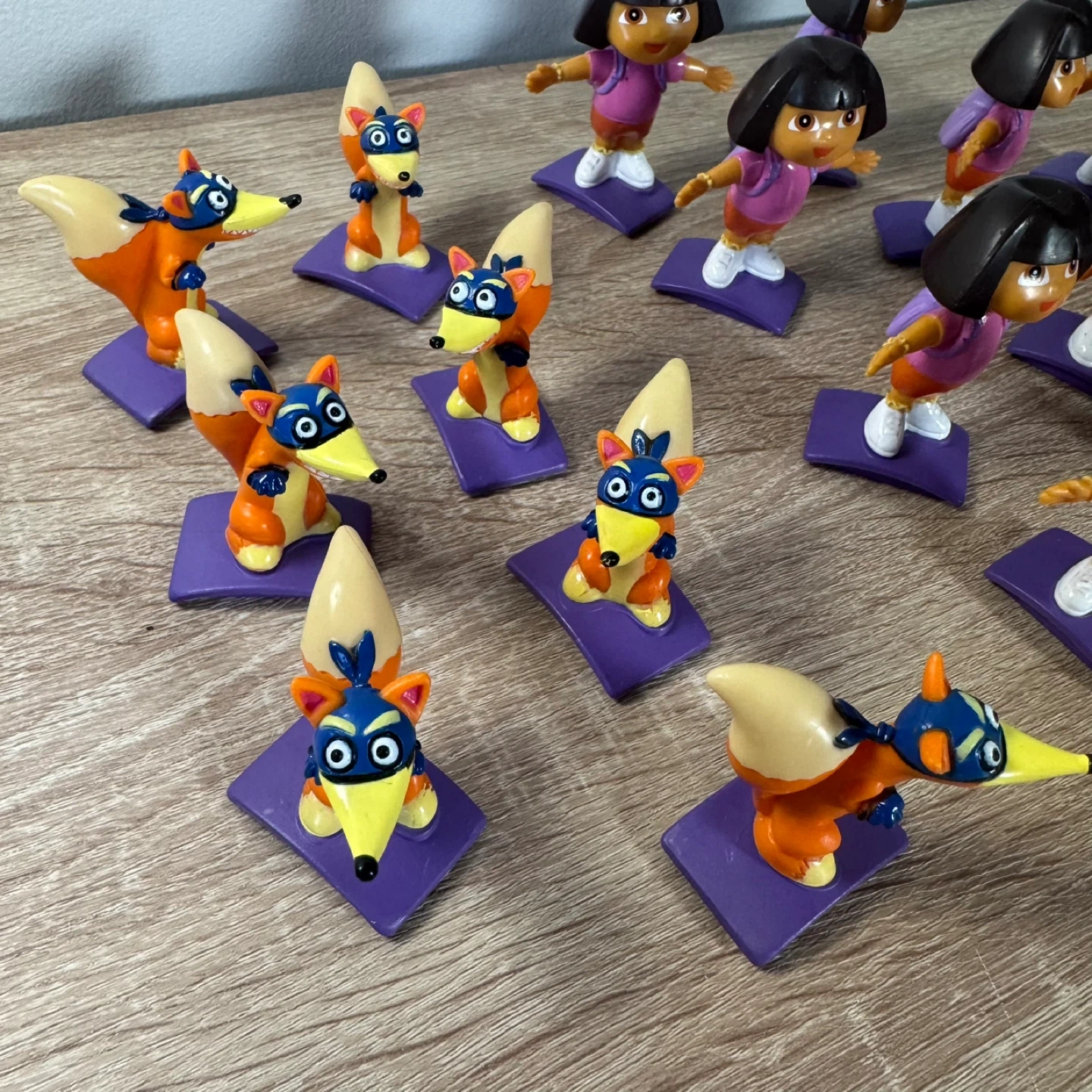 A collection of 18 pieces Dora the Explorer and Swiper action figures. These toys are designed for young children's play. Includes multiple figures.