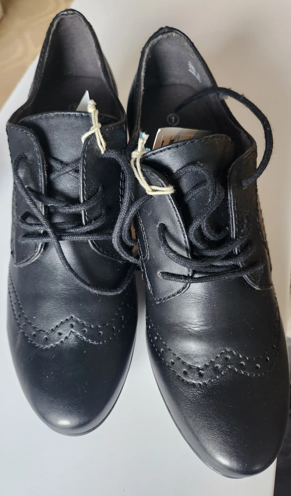 Black leather heeled vintage styled brogue shoes. Lace up style. UK Size 7, USA 9. Excellent condition, never worn.
