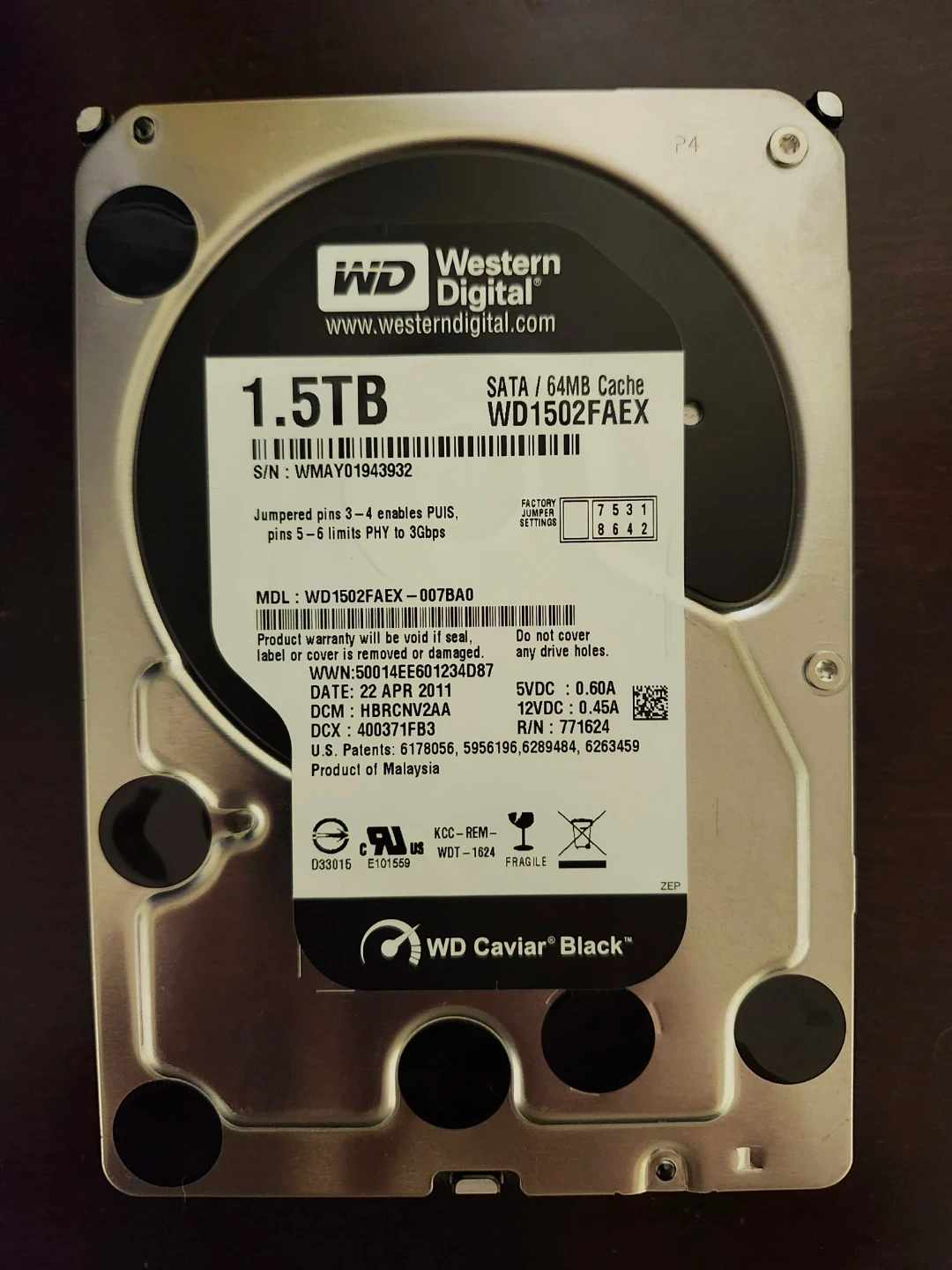 Western Digital 1.5TB internal hard drive. SATA interface with 64MB cache. Model WD1502FAEX. WD Caviar Black series. This drive is suitable for desktop computer upgrades.