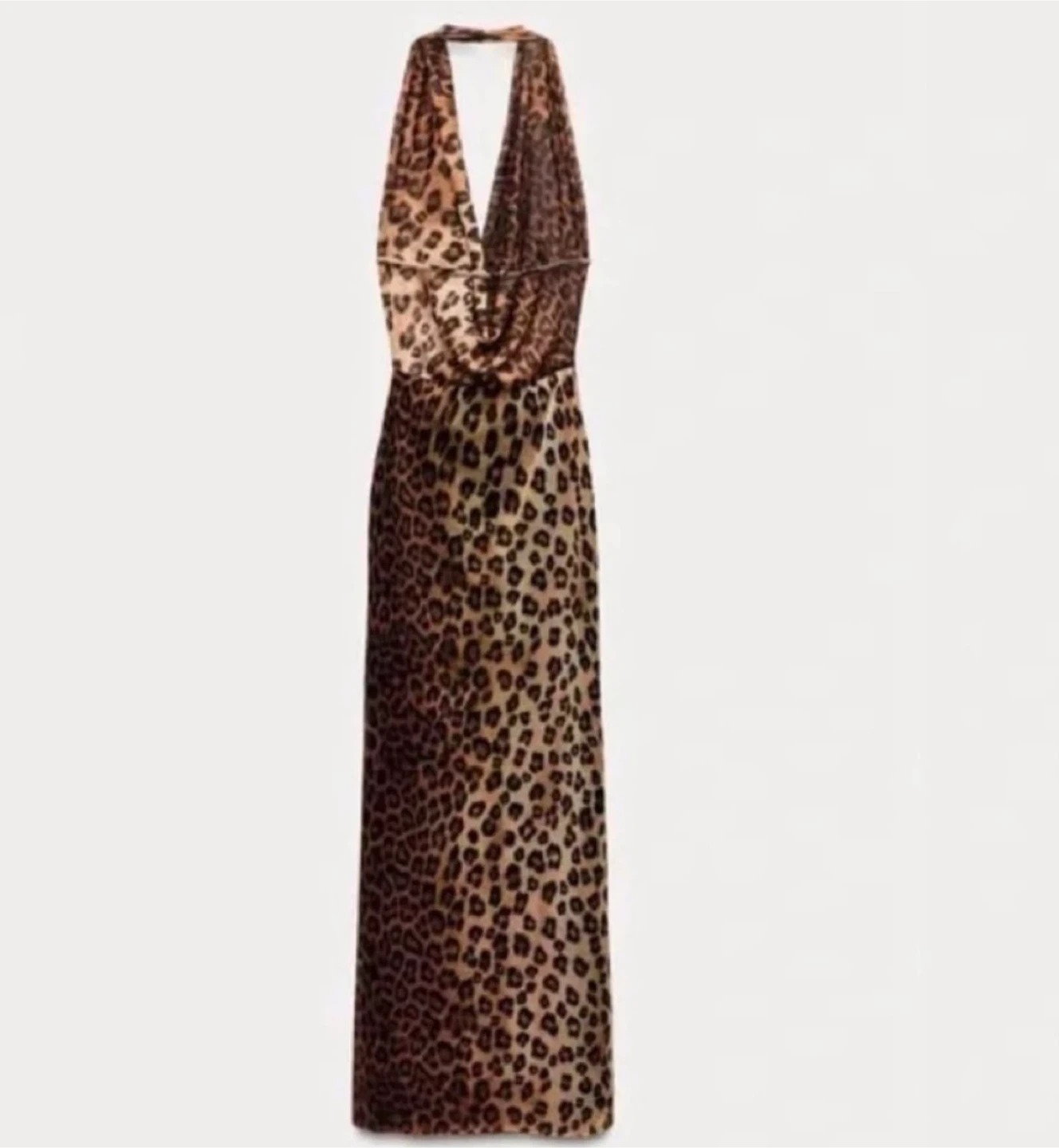 Long halter neck dress with plunging neckline and draped detail. Open back with strap and metal hook. Contrasting interior lining.