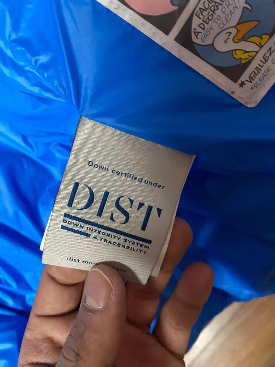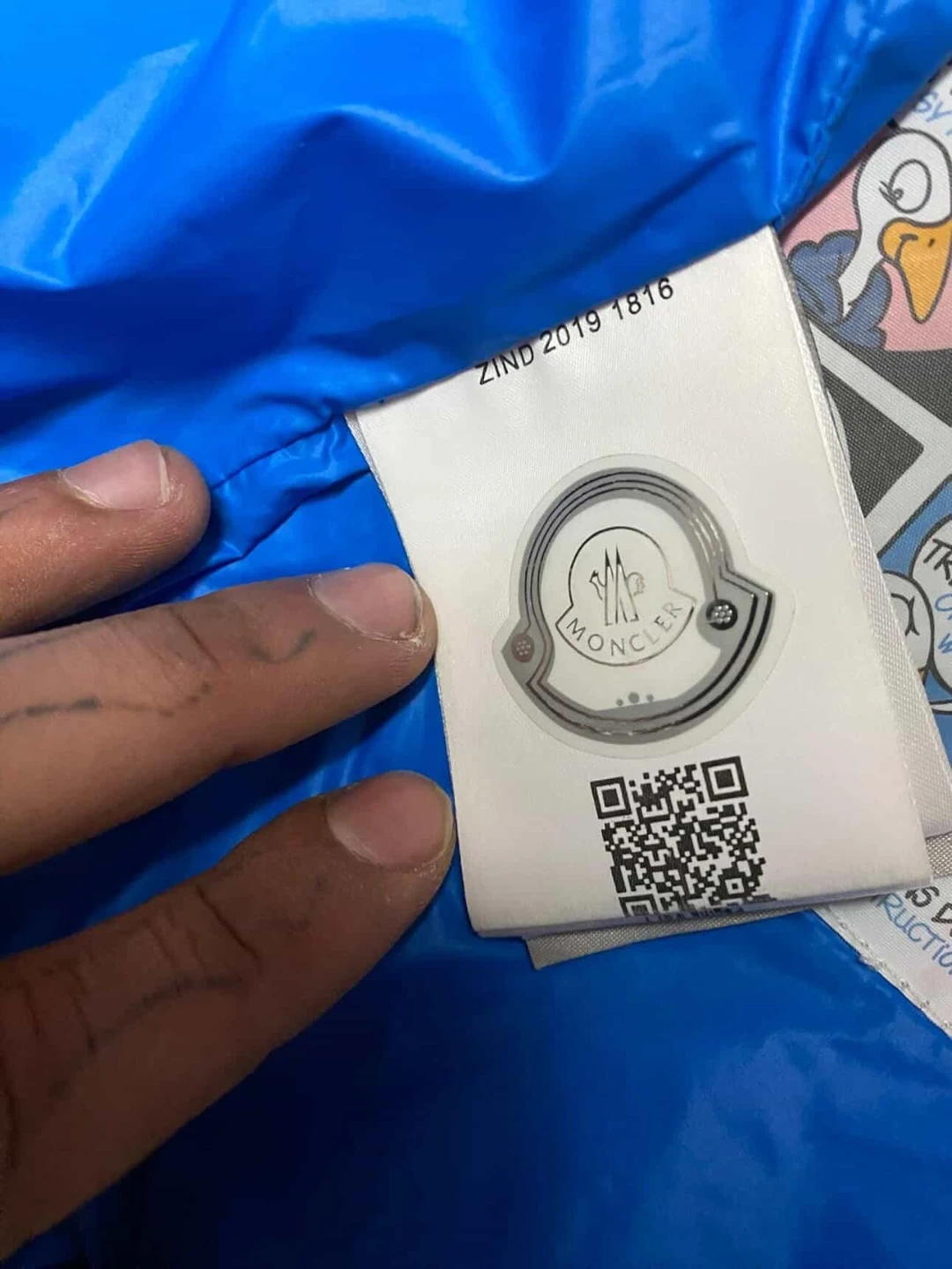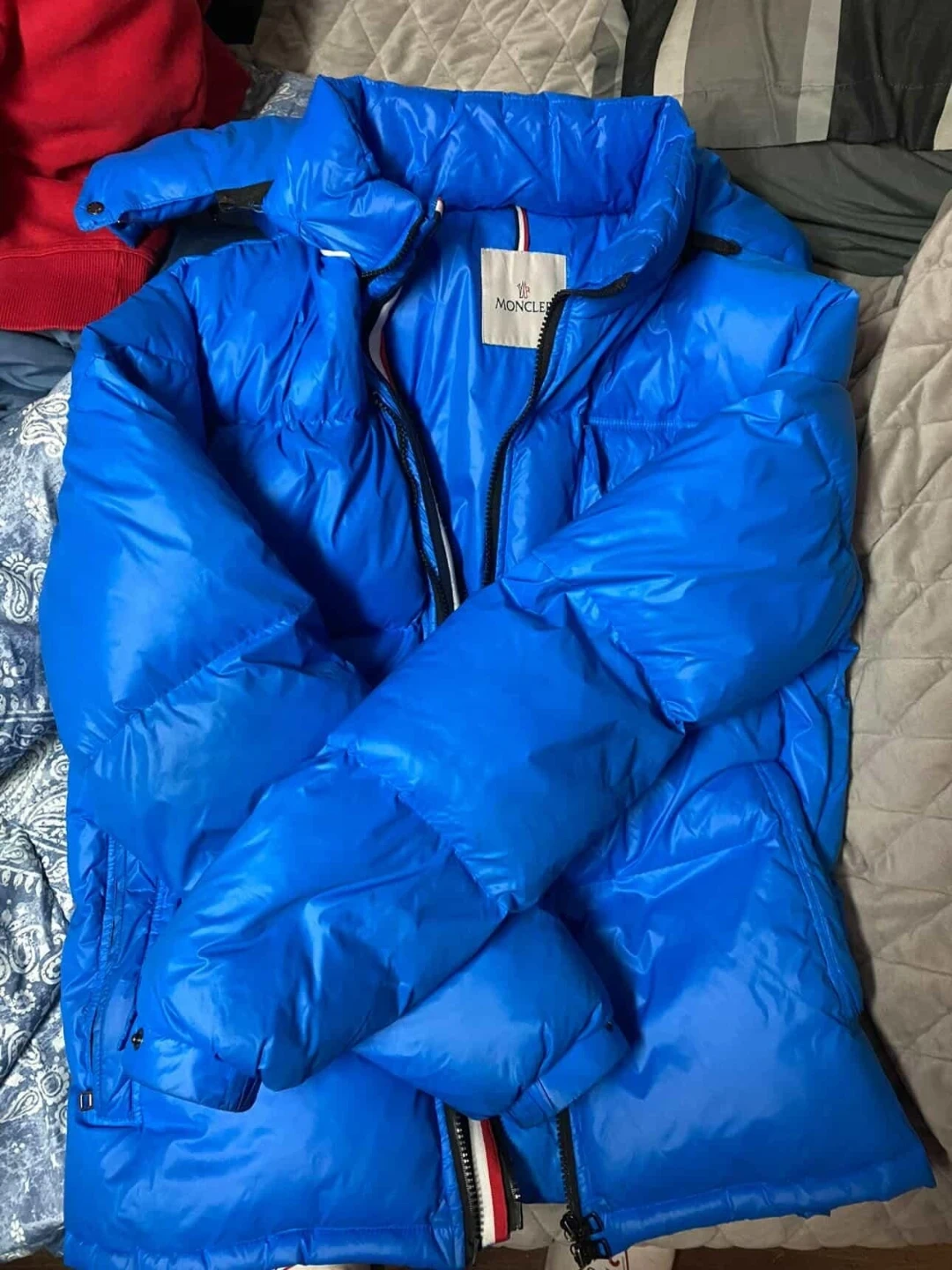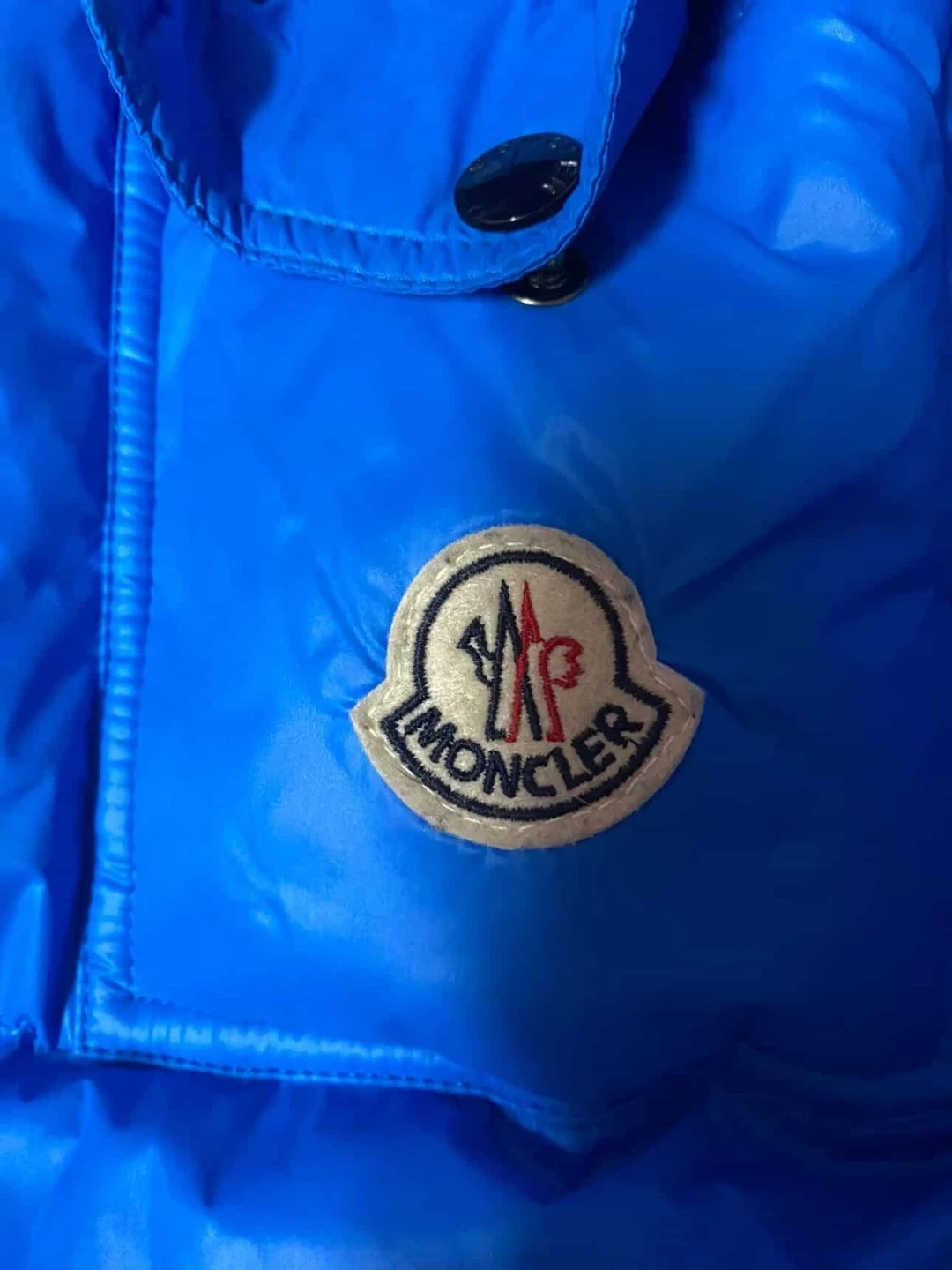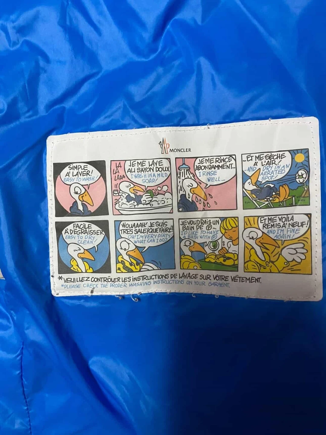 Moncler jacket in blue. Size is 3. Made with down for warmth. This jacket's care instructions are printed on the tag.
