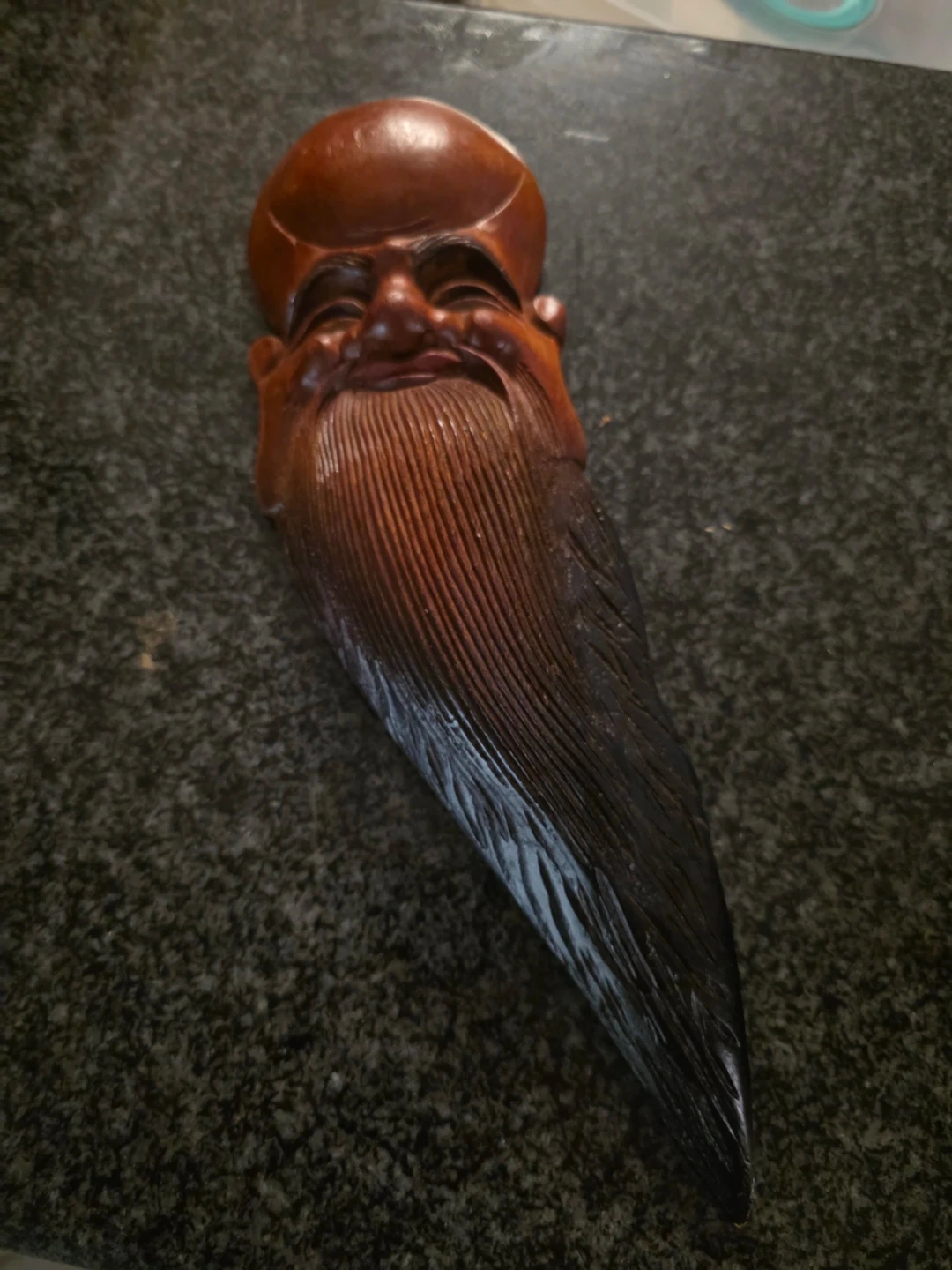 This item is a vintage, hand-carved wooden figure of a man with a long beard, likely representing the Japanese god of longevity, Fukurokuju.