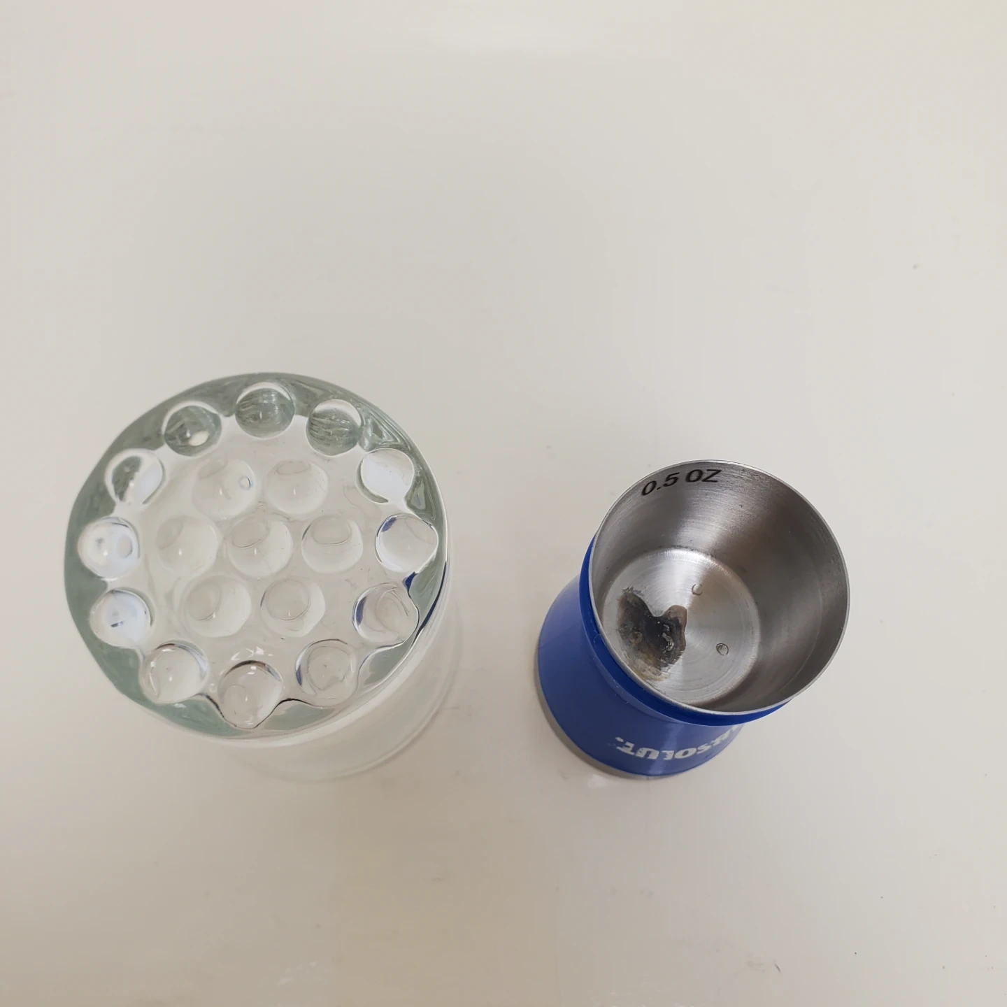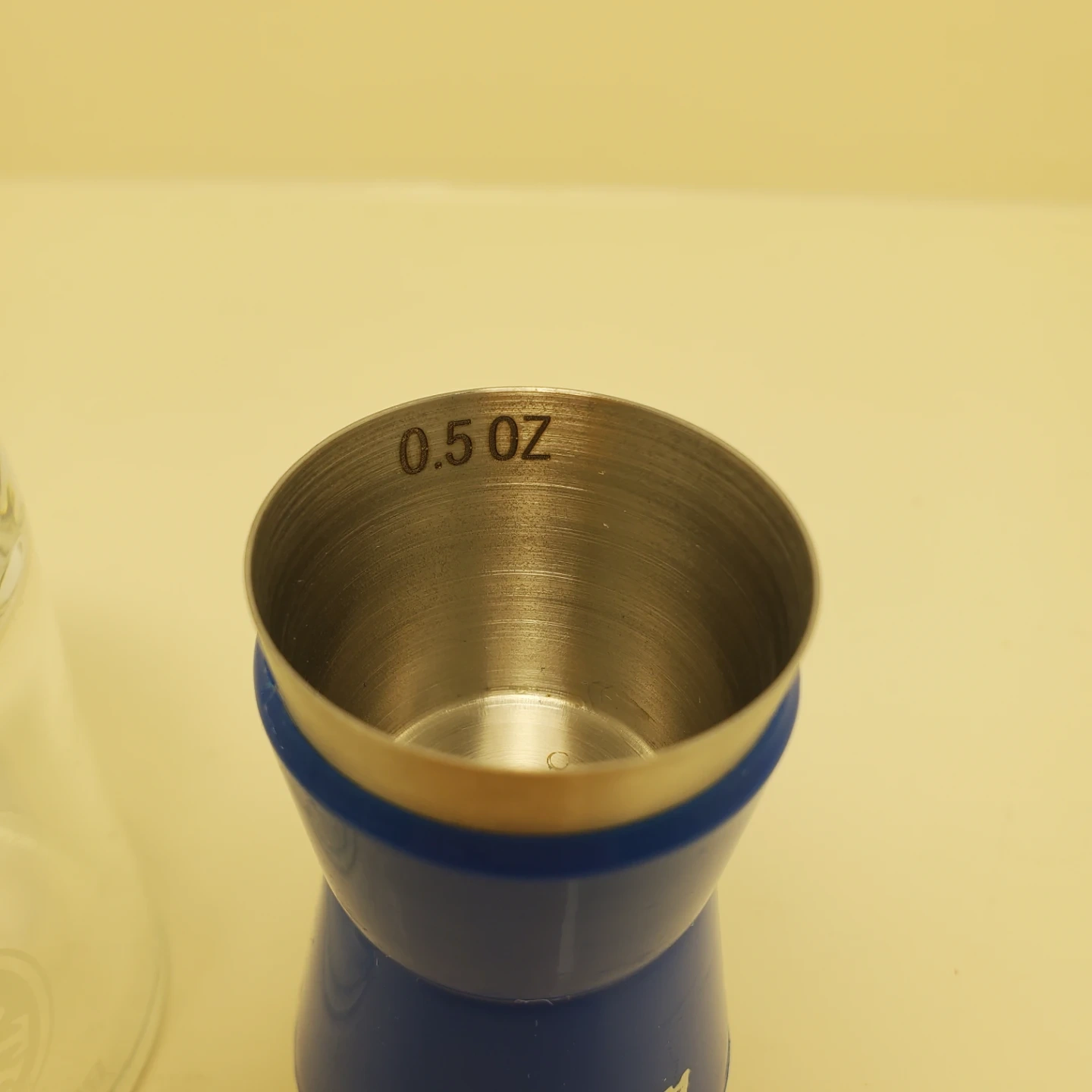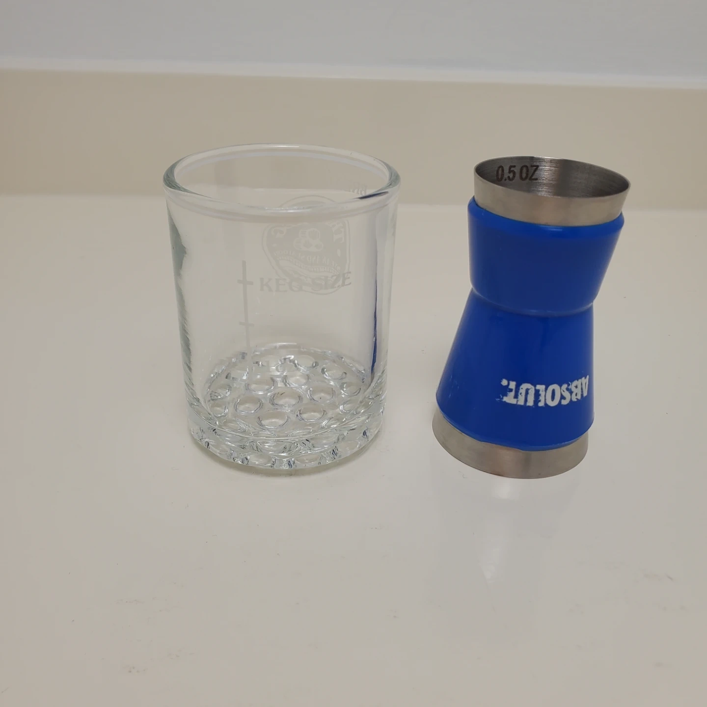 Includes an Absolut branded jigger with 0.5 oz and 1 oz markings. Also comes with a "The Keg" shot glass. Stainless steel jigger with blue plastic grip.