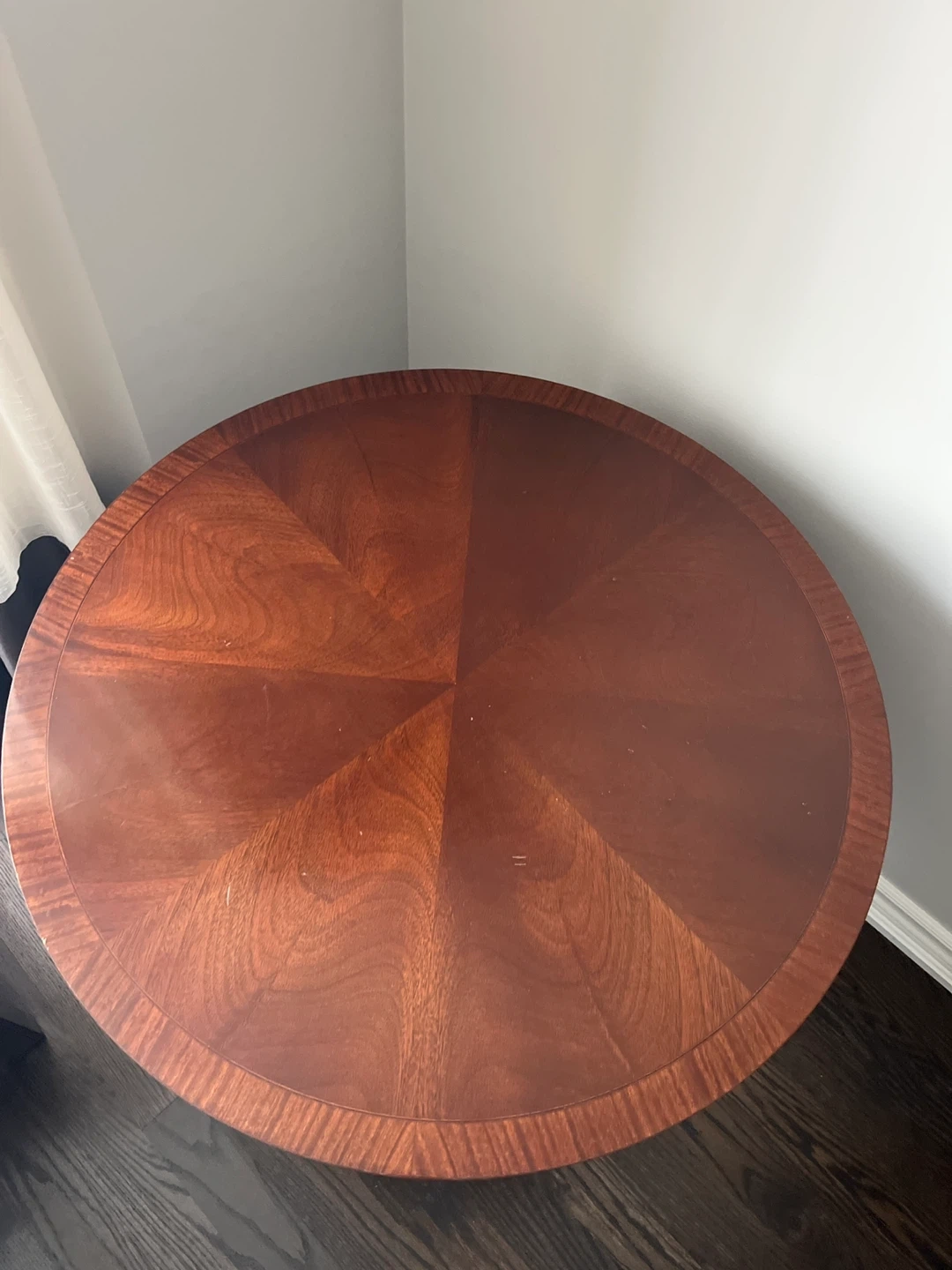 Beautiful round accent table with a rich mahogany finish! It features a classic design with a pedestal base and ornate details. Perfect for adding a touch of elegance to any room in your home