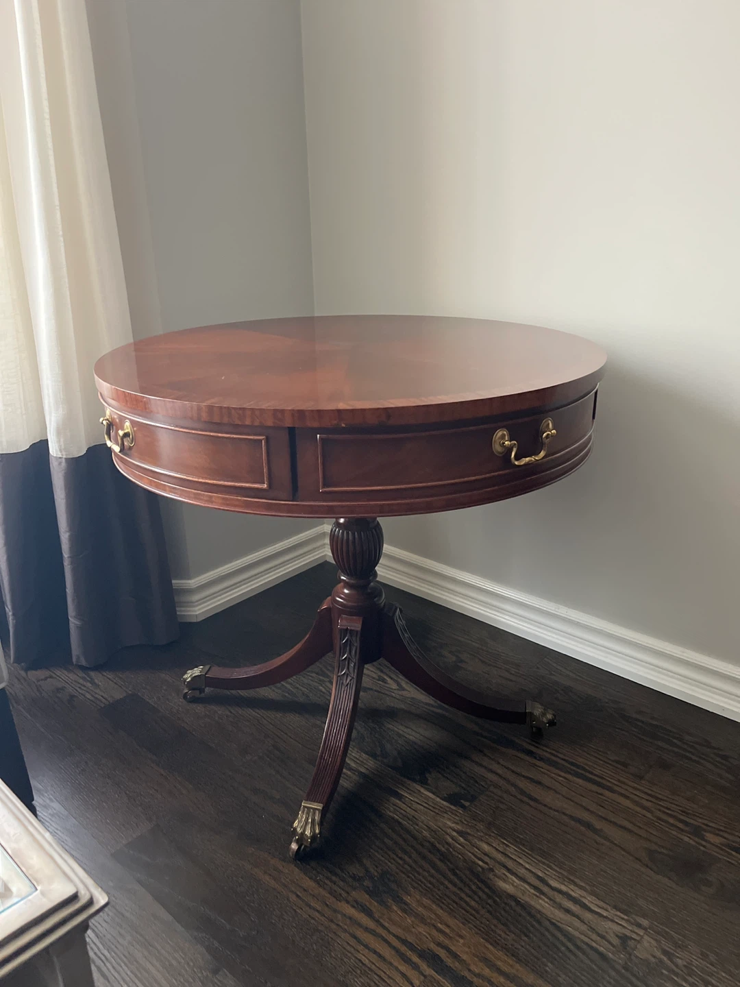 Beautiful round accent table with a rich mahogany finish! It features a classic design with a pedestal base and ornate details. Perfect for adding a touch of elegance to any room in your home
