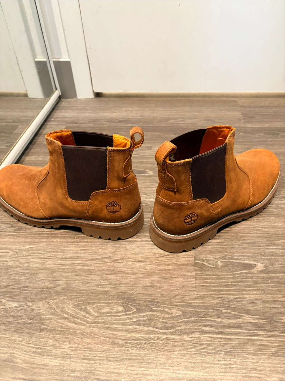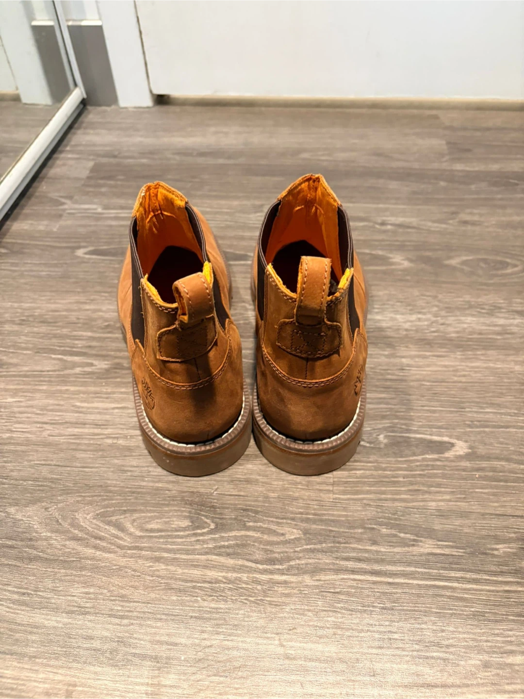 These Timberland Chelsea boots are crafted from tan suede. They feature a pull-tab at the heel for easy on and off. These boots are a size 8 US.