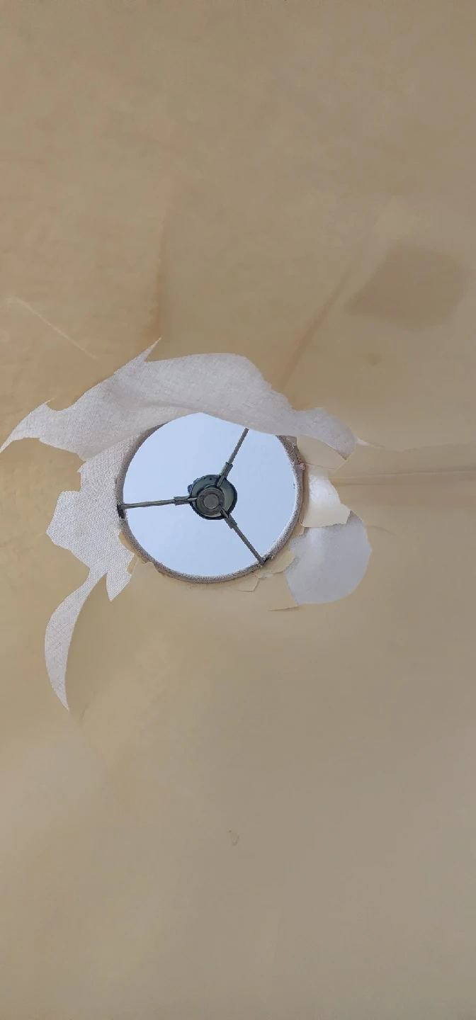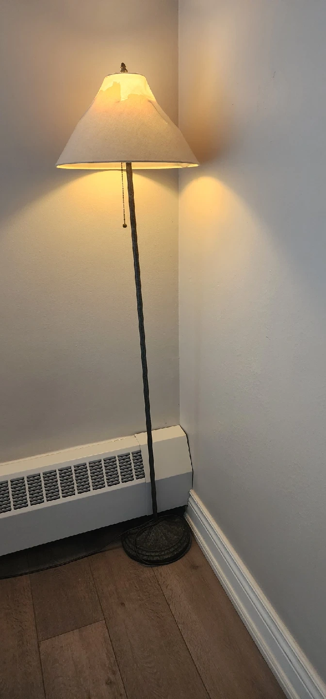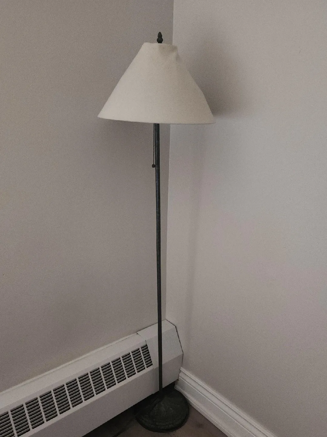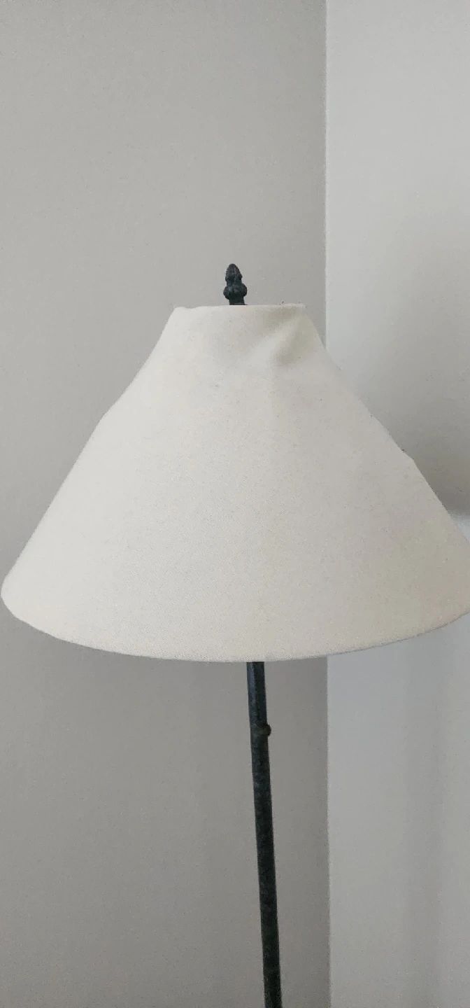 Selling a standing floor lamp with an off-white shade. It has a simple, classic design that would fit well in any room. Please note that the shade has some damage on the inside, as shown in the photos.