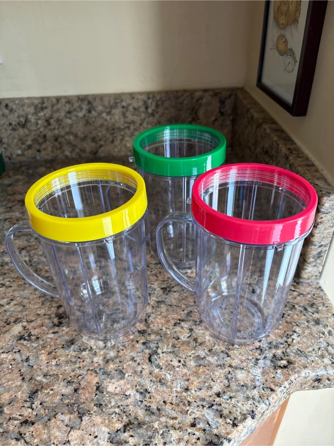 Three plastic blender cups with coloured lids (green, yellow, red). Cups have measurement markings and a handle. They're perfect for making individual smoothies or shakes!