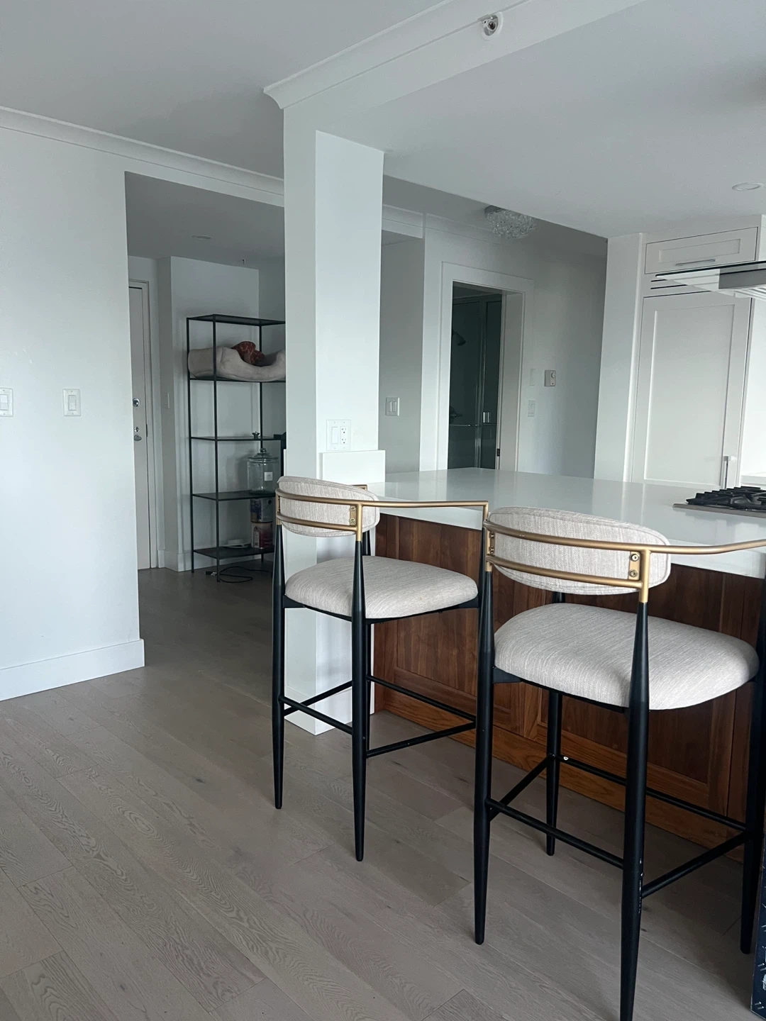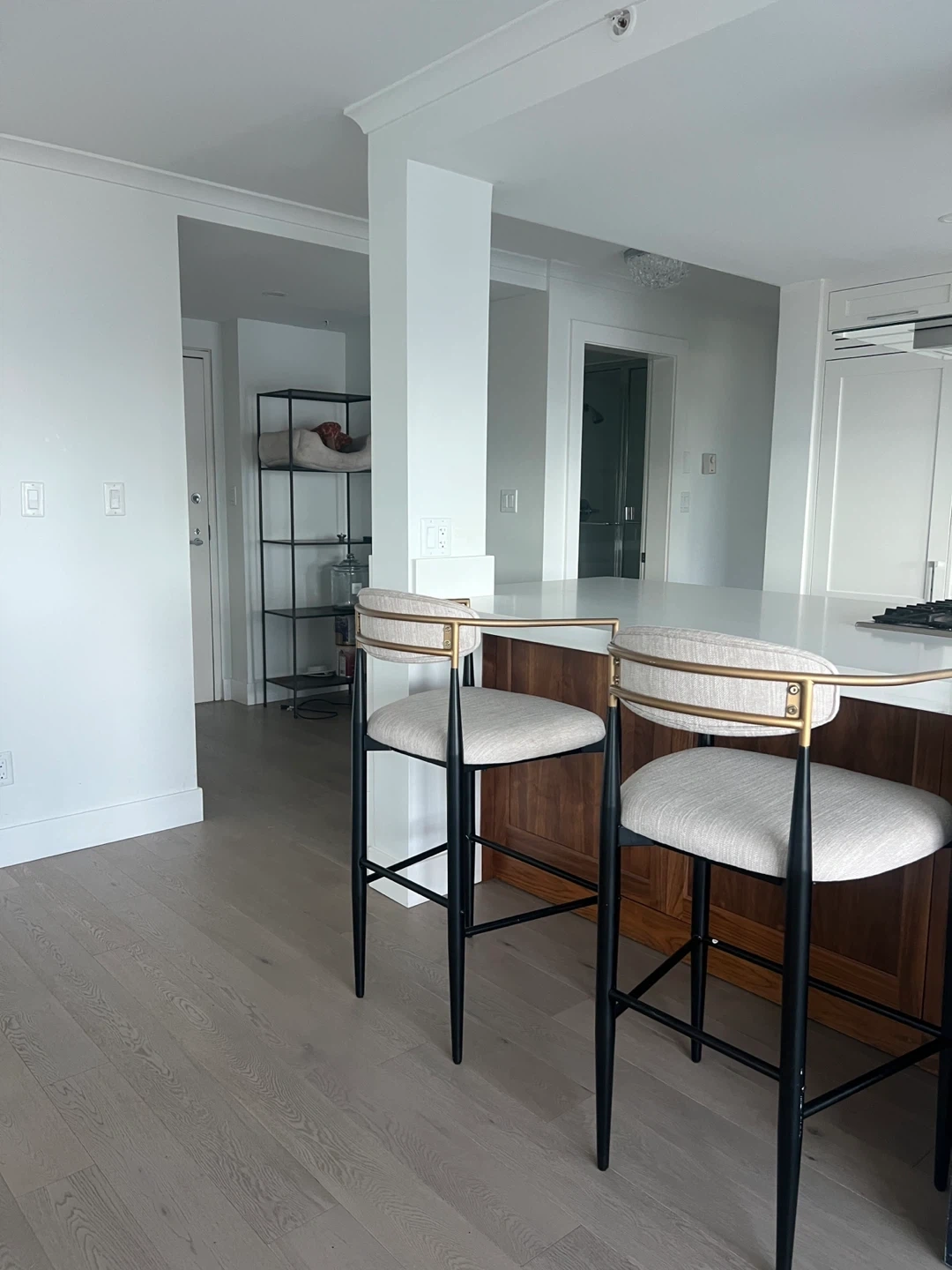 Selling a bar stool with a sleek design! It features a comfortable seat and backrest, complemented by elegant gold accents. The black legs provide a sturdy base. It's in great shape and would look fantastic in any kitchen or bar area